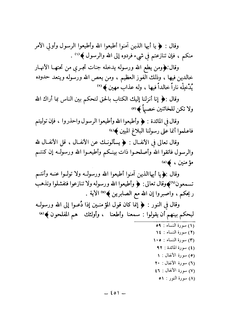 وَقَالَ فِي النُّور {إِنَّمَا كَانَ قَول الْمُؤمنِينَ إِذا دعوا إِلَى الله وَرَسُوله ليحكم بَينهم أَن يَقُولُوا سمعنَا وأطعنا وَأُولَئِكَ هم المفلحون}