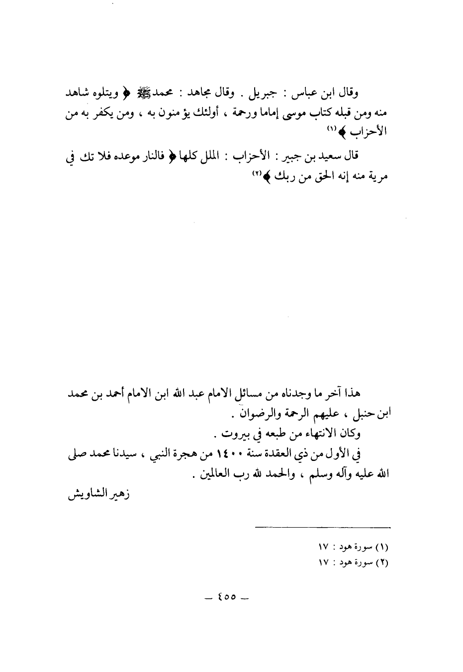 هَذَا آخر مَا وَجَدْنَاهُ من مسَائِل الامام عبد الله ابْن الامام احْمَد بن مُحَمَّد ابْن حَنْبَل عَلَيْهِم الرَّحْمَة والرضوان