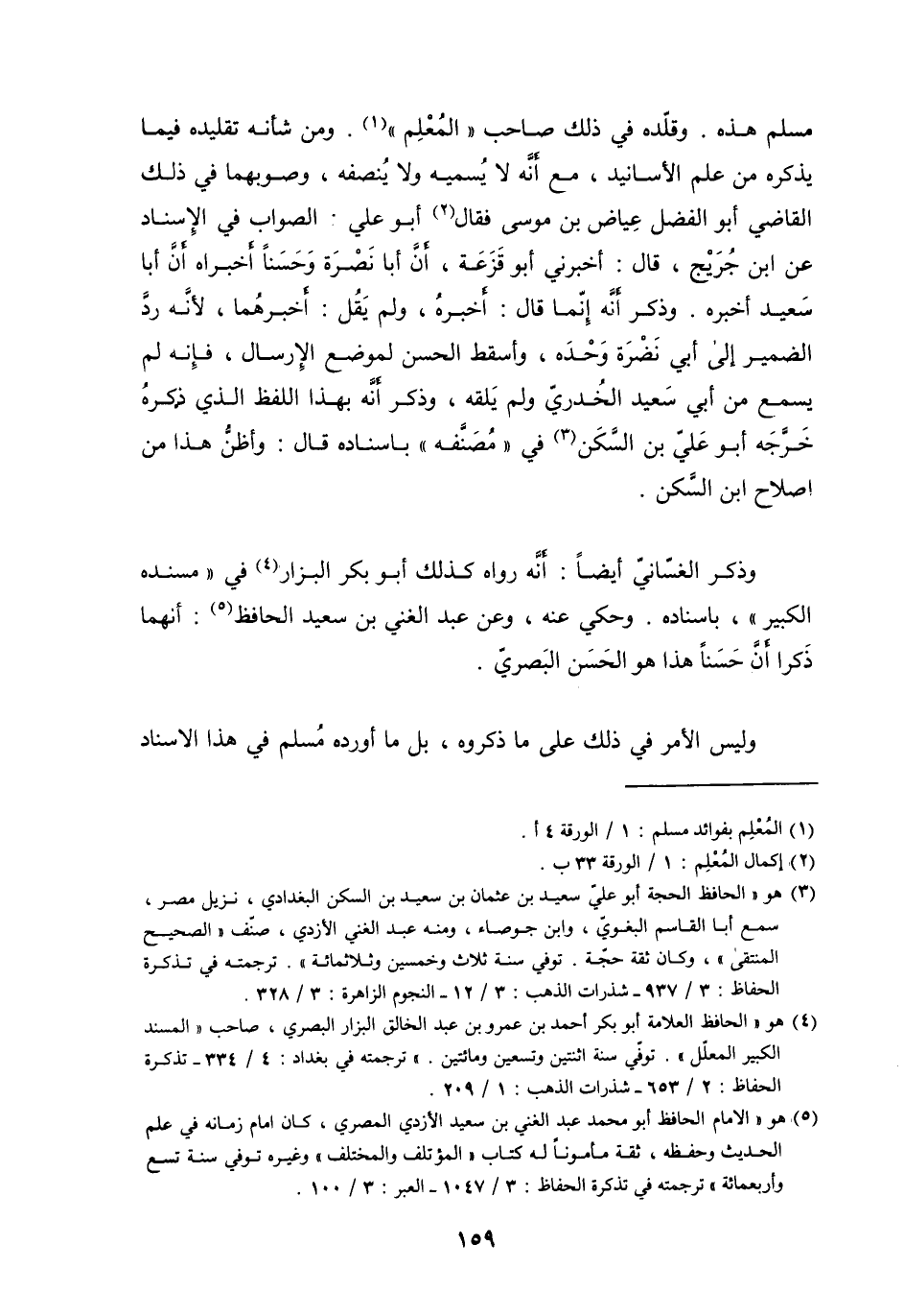وَمن ذَلِك أَن أَبَا عَليّ الغساني صَاحب تَقْيِيد المهمل رد رِوَايَة مُسلم هَذِه وقلده فِي ذَلِك صَاحب الْمعلم وَمن شَأْنه تَقْلِيده فِي مَا يذكرهُ من علم الْأَسَانِيد مَعَ أَنه لَا يُسَمِّيه وَلَا ينصفه وصوبهما فِي ذَلِك القَاضِي أَبُو الْفضل عِيَاض ابْن مُوسَى فَقَالَ أَبُو عَليّ الصَّوَاب فِي الْإِسْنَاد عَن ابْن جريج قَالَ أَخْبرنِي أَبُو قزعة أَن أَبَا نَضرة وحسنا أخبراه أَن أَبَا سعيد أخبرهُ وَذكر أَنه إِنَّمَا قَالَ أخبرهُ وَلم يقل أخبرهما لِأَنَّهُ رد الضَّمِير إِلَى أبي نَضرة وَحده وَأسْقط الْحسن لموْضِع