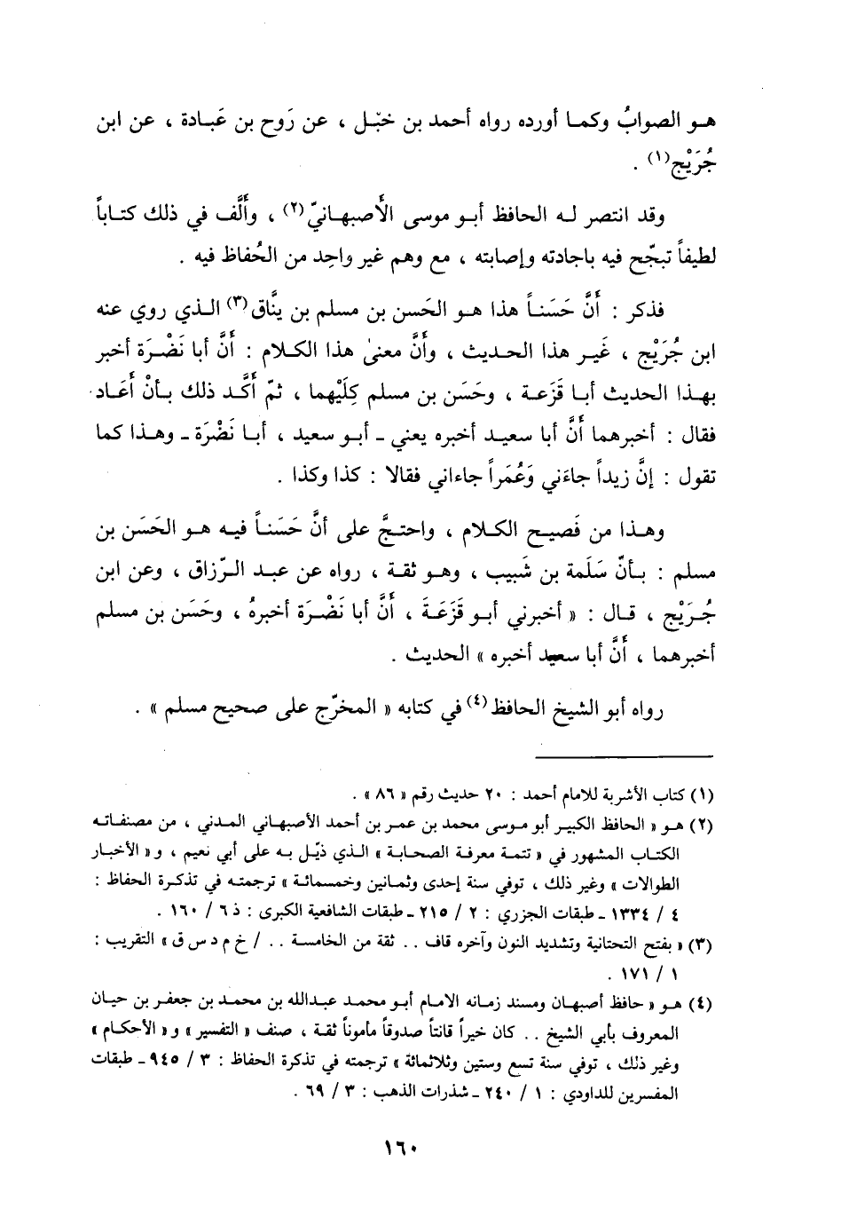 وَقد انتصر لَهُ الْحَافِظ أَبُو مُوسَى الْأَصْبَهَانِيّ وَألف فِي ذَلِك كتابا لطيفا تبجح فِيهِ بإجادته وإصابته مَعَ وهم غير وَاحِد من الْحفاظ فِيهِ