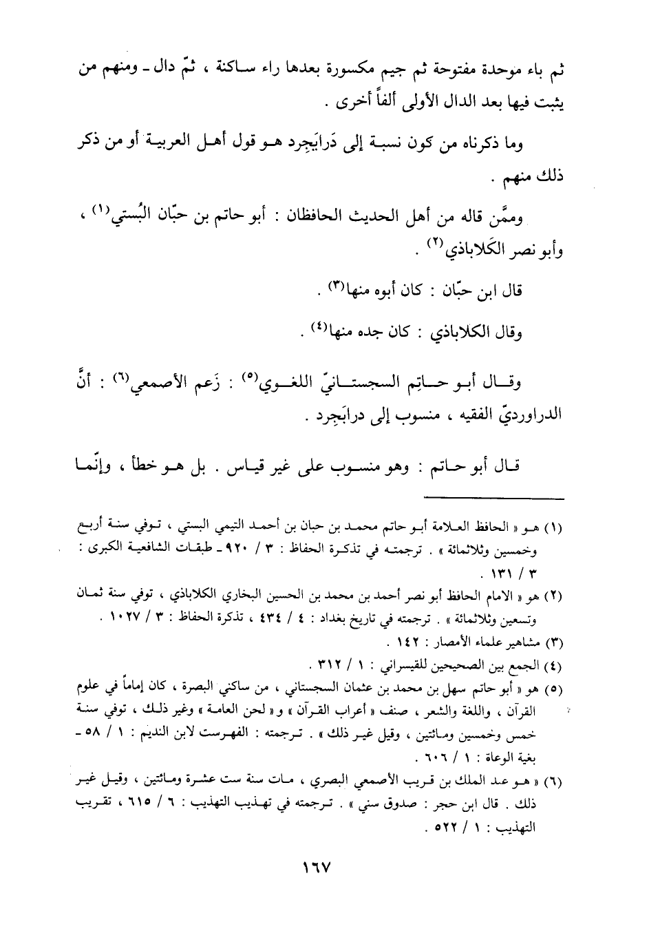 والأثبت فِيهِ انه نسب شَاذ مسموع على غير الْقيَاس وَأَنه نِسْبَة إِلَى درابجرد مَدِينَة من فَارس وَهِي بدال مُهْملَة مَفْتُوحَة ثمَّ رَاء بعْدهَا ألف ثمَّ بَاء مُوَحدَة مَفْتُوحَة ثمَّ جِيم مَكْسُورَة بعْدهَا رَاء سَاكِنة ثمَّ دَال وَمِنْهُم من يثبت فِيهَا بعد الدَّال الأولى ألفا أُخْرَى