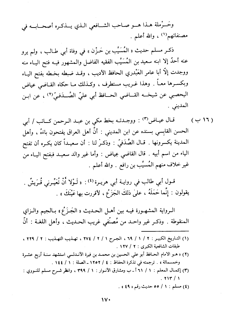 ذكر مُسلم حَدِيث الْمسيب بن حزن فِي وَفَاة أبي طَالب وَلم يرو عَنهُ أحد إِلَّا ابْنه سعيد بن الْمسيب الْفَقِيه الْفَاضِل وَالْمَشْهُور فِيهِ فتح الْيَاء مِنْهُ وَوجدت أَبَا عَامر الْعَبدَرِي الْحَافِظ الأديب قد ضَبطه بِخَطِّهِ بِفَتْح الْيَاء وبكسرها مَعًا وَهَذَا غَرِيب مستطرف وَكَذَلِكَ مَا حَكَاهُ القَاضِي عِيَاض الْيحصبِي عَن شَيْخه القاضى الْحَافِظ أبي عَليّ الصَّدَفِي عَن ابْن الْمَدِينِيّ قَالَ عِيَاض وَوَجَدته بِخَط مكي بن عبد الرَّحْمَن كَاتب أبي الْحسن الْقَابِسِيّ بِسَنَدِهِ عَن ابْن الْمَدِينِيّ أَن أهل الْعرَاق يفتحون ياءه واهل الْمَدِينَة يكسرونها قَالَ الصَّدَفِي وَذكر لنا ان سعيدا كَانَ يكره أَن تفتح الْيَاء من اسْم أَبِيه