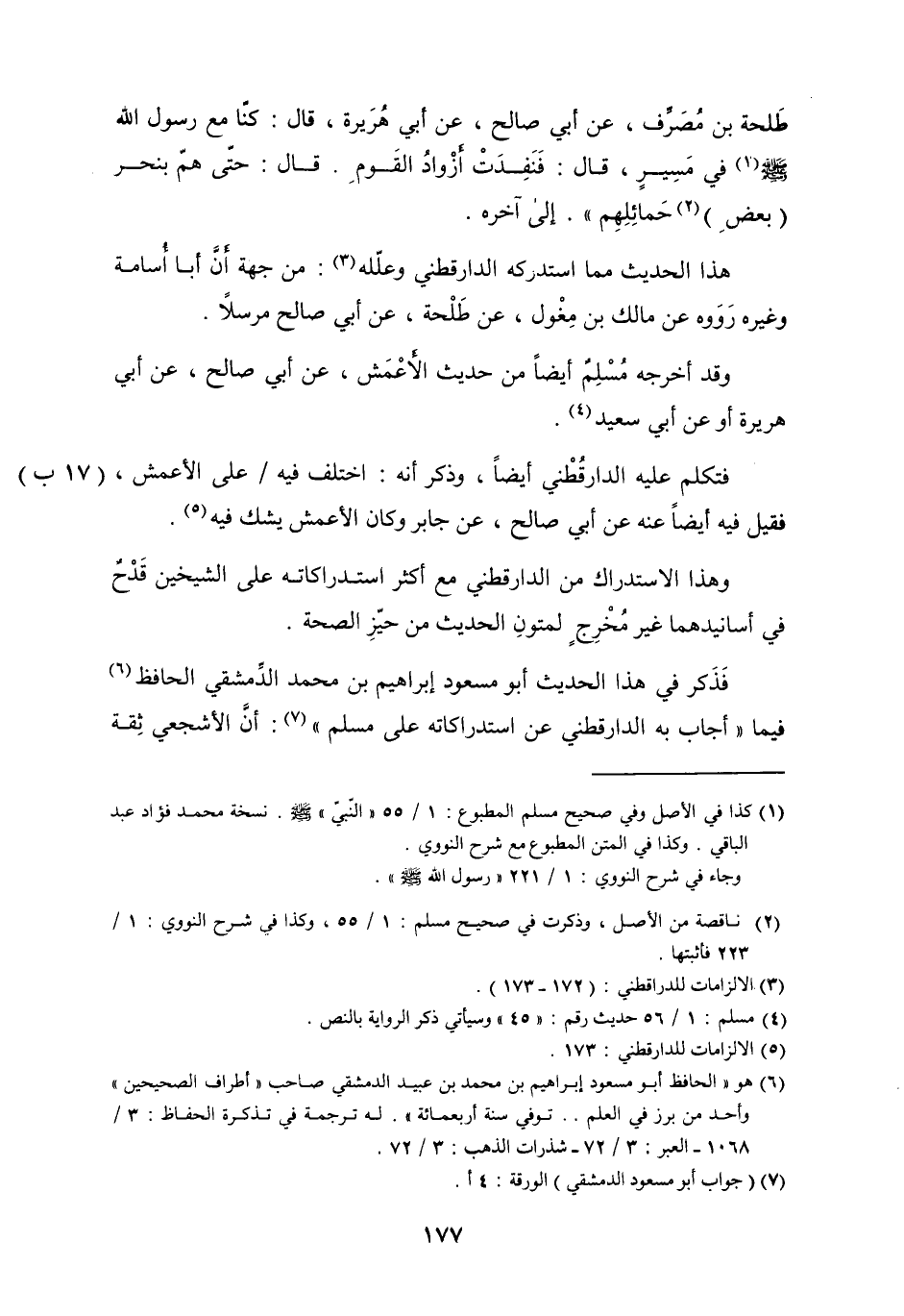 هَذَا الحَدِيث مِمَّا استدركه الدَّارَقُطْنِيّ وَعلله من جِهَة أَن أَبَا أُسَامَة وَغَيره رَوَوْهُ عَن مَالك بن مغول عَن طَلْحَة عَن أبي صَالح مُرْسلا