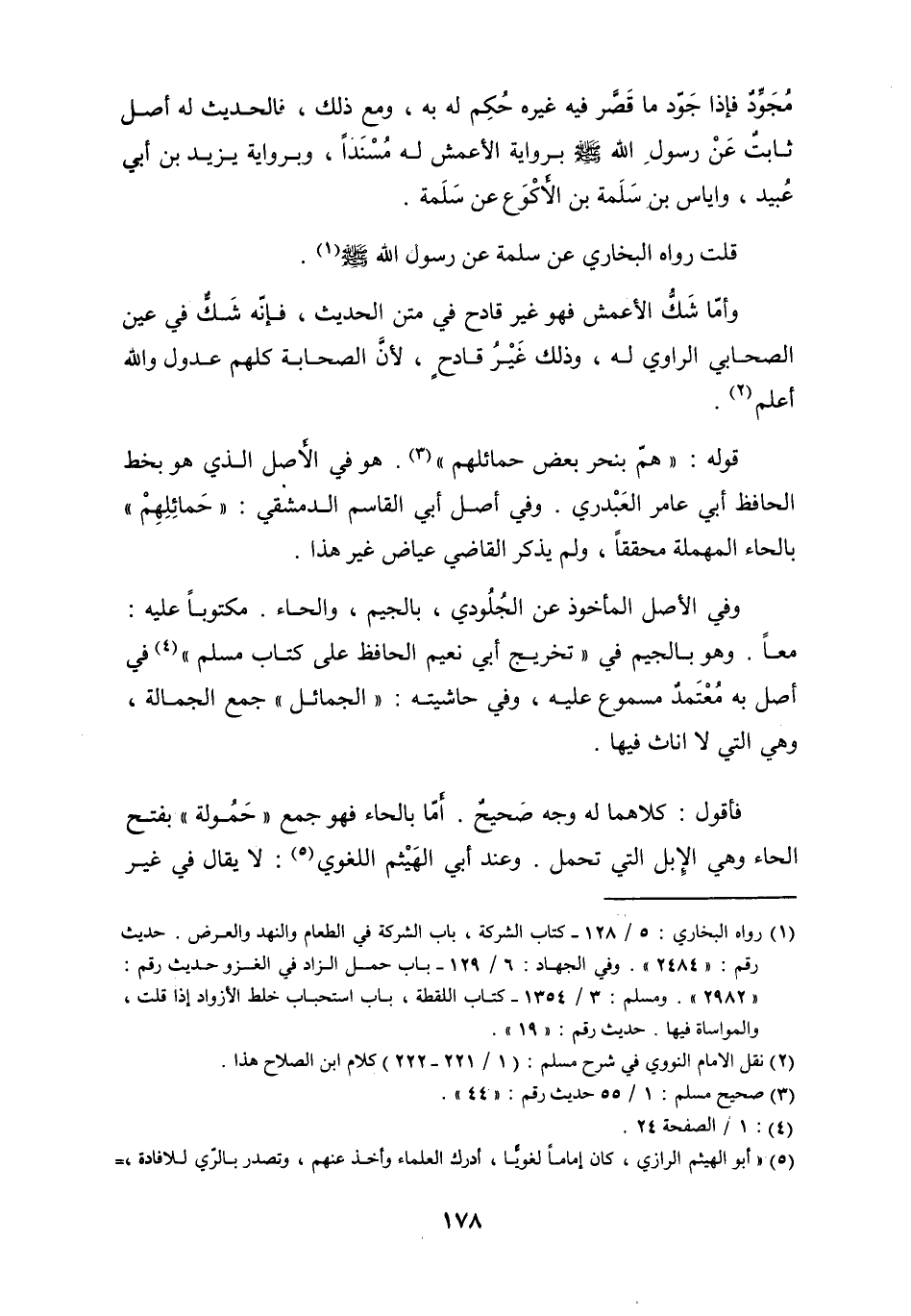 وَفِي الأَصْل الْمَأْخُوذ عَن الجلودي بِالْجِيم والحاء مَكْتُوبًا عَلَيْهِ مَعًا وَهُوَ بِالْجِيم فِي تَخْرِيج أبي نعيم الْحَافِظ على كتاب مُسلم فِي أصل بِهِ مُعْتَمد مسموع عَلَيْهِ وَفِي حَاشِيَته الجمائل جمع الجمالة وَهِي الَّتِي لَا أناث فِيهَا