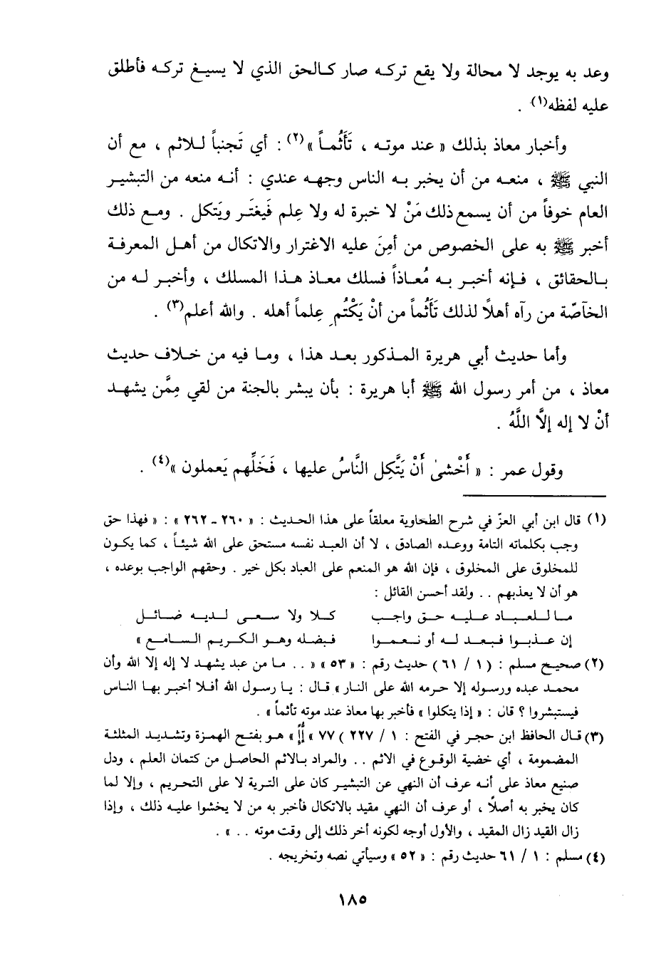 وإخبار معَاذ بذلك عِنْد مَوته تأثما أَي تجنبا للإثم مَعَ أَن النَّبِي صلى الله عَلَيْهِ وَسلم مَنعه من أَن يخبر بِهِ النَّاس وَجهه عِنْدِي أَنه مَنعه من التبشير الْعَام خوفًا من أَن يسمع ذَلِك من لَا خبْرَة لَهُ وَلَا علم فيغتر ويتكل وَمَعَ ذَلِك أخبر صلى الله عَلَيْهِ وَسلم بِهِ على الْخُصُوص من أَمن عَلَيْهِ الاغترار والاتكال من أهل الْمعرفَة بالحقائق فَإِنَّهُ أخبر بِهِ معَاذًا فسلك معَاذ هَذَا المسلك وَأخْبر بِهِ من الْخَاصَّة من رَآهُ أَهلا لذَلِك تأثما من أَن يكتم علما أَهله وَالله أعلم