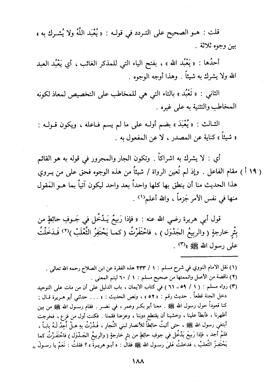 الْفَاعِل وَإِذ لم تعين الروَاة شَيْئا من هَذِه الْوُجُوه فَحق على من يروي هَذَا الحَدِيث منا أَن ينْطق بهَا كلهَا وَاحِدًا بعد وَاحِد ليَكُون آتِيَا بِمَا هُوَ الْمَقُول مِنْهَا فِي نفس الْأَمر جزما وَالله أعلم