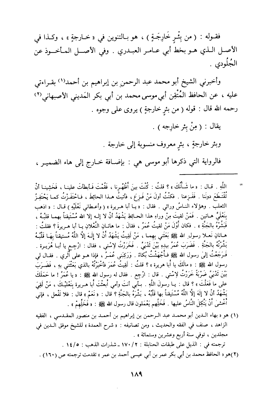 وَأَخْبرنِي الشَّيْخ أَبُو مُحَمَّد عبد الرَّحْمَن بن إِبْرَاهِيم بن أَحْمد بِقِرَاءَتِي عَلَيْهِ عَن الْحَافِظ المتقن أبي مُوسَى مُحَمَّد بن أبي بكر الْمَدِينِيّ الْأَصْبَهَانِيّ رَحمَه الله قَالَ قَوْله من بِئْر خَارِجَة يرْوى على وُجُوه