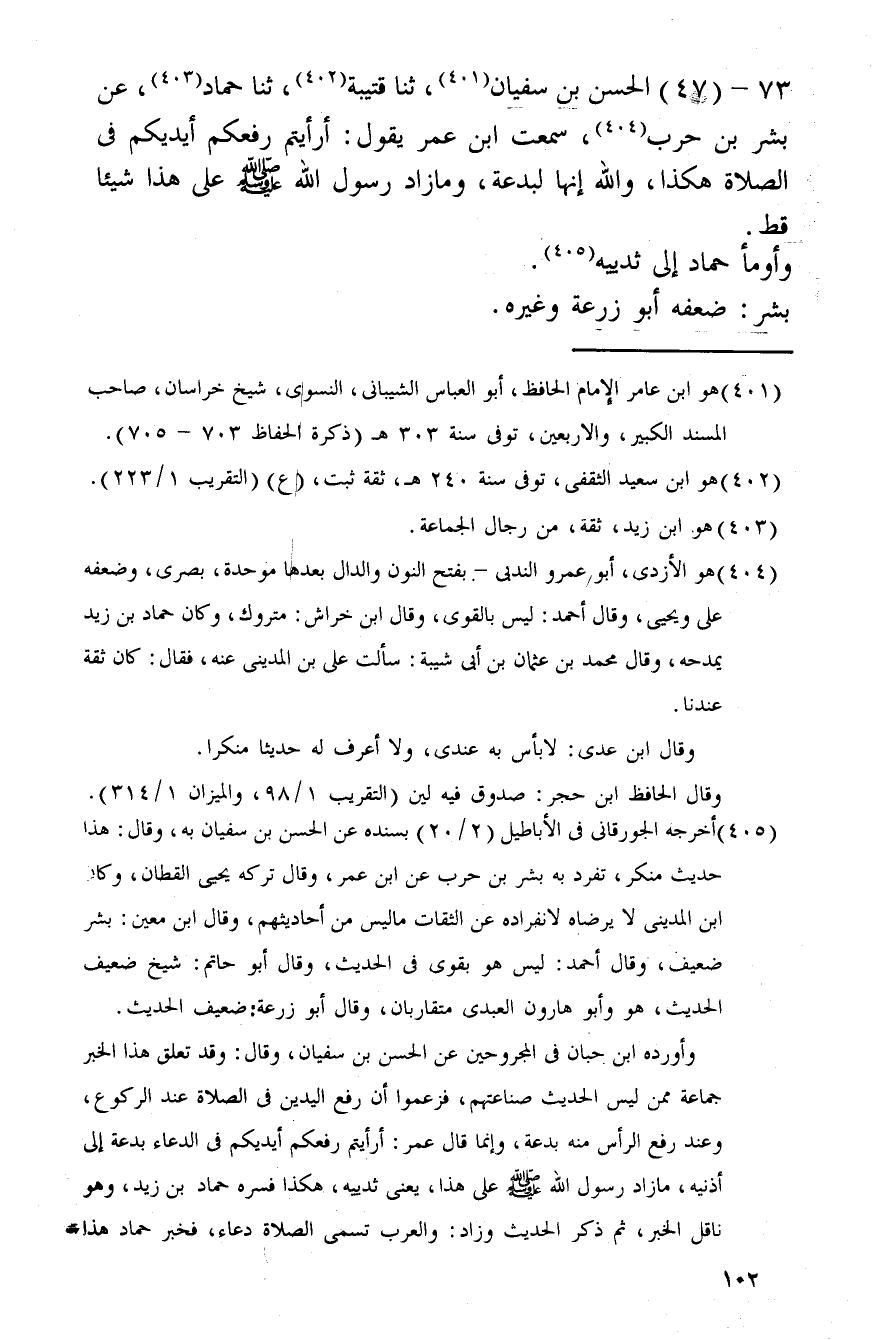 73 - (47) الْحسن بن سُفْيَان، ثَنَا قُتَيْبَة، ثَنَا حَمَّاد، عَن بشر بن حَرْب، سَمِعت ابْن عمر يَقُول: أَرَأَيْتُم رفعكم أَيْدِيكُم فِي الصَّلَاة هَكَذَا، وَالله إِنَّهَا لبدعة، وَمَا زَاد رَسُول الله صلى الله عَلَيْهِ وَسلم على هَذَا شَيْئا قطّ. وَأَوْمَأَ حَمَّاد إِلَى ثدييه. بشر: ضعفه أَبُو زرْعَة وَغَيره.