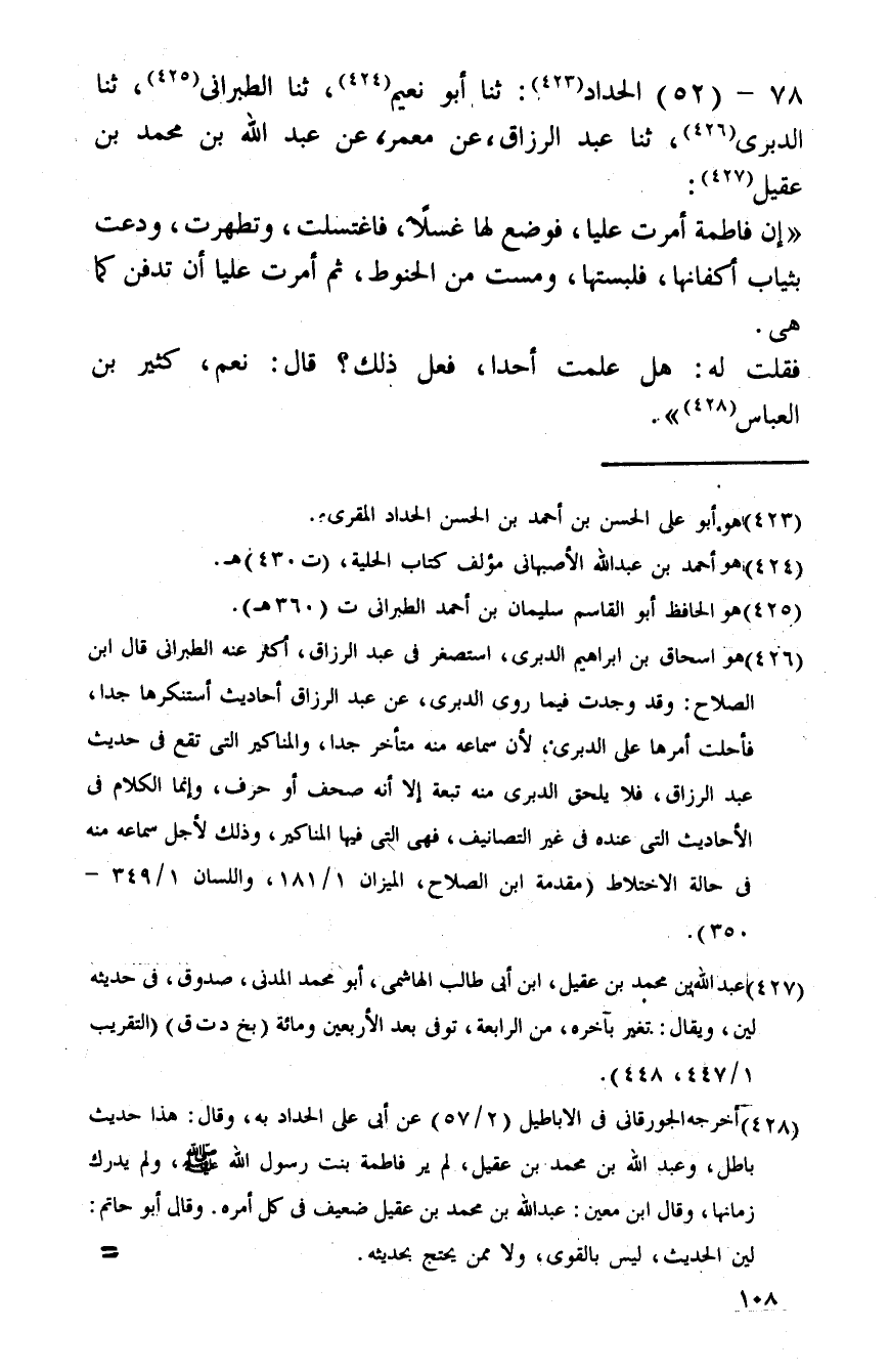 78 - (52) الْحداد: ثَنَا أَبُو نعيم، ثَنَا الطَّبَرَانِيّ، ثَنَا الدبرِي، ثَنَا عبد الرَّزَّاق، عَن معمر، عَن عبد الله بن مُحَمَّد بن عقيل: " إِن فَاطِمَة أمرت عليا، فَوضع لَهَا غسلا، فاغتسلت، وتطهرت، ودعت بِثِيَاب أكفانها، فلبستها، ومست من الحنوط، ثمَّ أمرت عليا أَن تدفن كَمَا هِيَ. فَقلت لَهُ: هَل علمك أحدا، فعل ذَلِك؟ قَالَ: نعم، كثير بن الْعَبَّاس ".