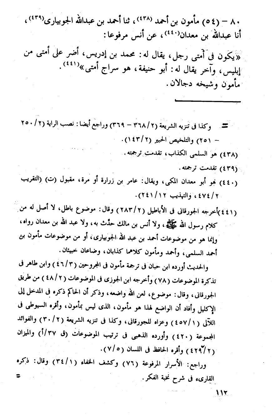 80 - (54) مَأْمُون بن أَحْمد، ثَنَا أَحْمد بن عبد الله الجوبياري، أَنا عبد الله بن معدان، عَن أنس مَرْفُوعا: " يكون فِي أمتِي رجل، يُقَال لَهُ: مُحَمَّد بن إِدْرِيس، أضرّ على أمتِي من إِبْلِيس، وَآخر يُقَال لَهُ أَبُو حنيفَة، هُوَ سراج أمتِي ". مَأْمُون وَشَيْخه دجالان.