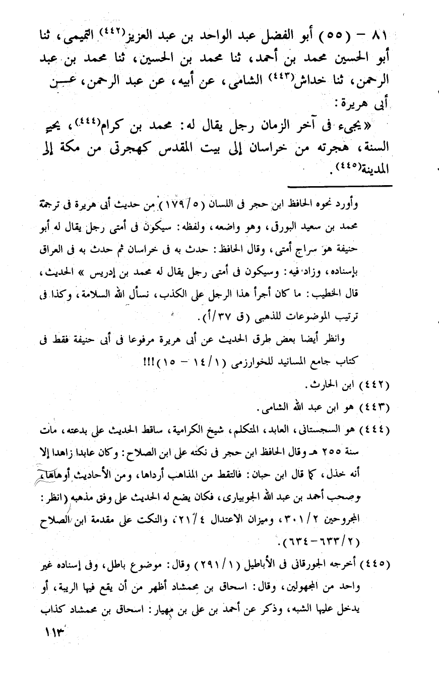 81 - (55) أَبُو الْفضل عبد الْوَاحِد بن عبد الْعَزِيز التَّمِيمِي، ثَنَا أَبُو الْحُسَيْن مُحَمَّد بن أَحْمد، ثَنَا مُحَمَّد بن الْحُسَيْن، ثَنَا مُحَمَّد بن عبد الرَّحْمَن، ثَنَا خِدَاش الشَّامي، عَن أَبِيه، عَن عبد الرَّحْمَن، عَن أبي هُرَيْرَة: " يَجِيء فِي آخر الزَّمَان رجل يُقَال لَهُ: مُحَمَّد بن كرام، يحيى السّنة، هجرته م خُرَاسَان إِلَى بَيت الْمُقَدّس كهجرتي من مَكَّة إِلَى الْمَدِينَة.