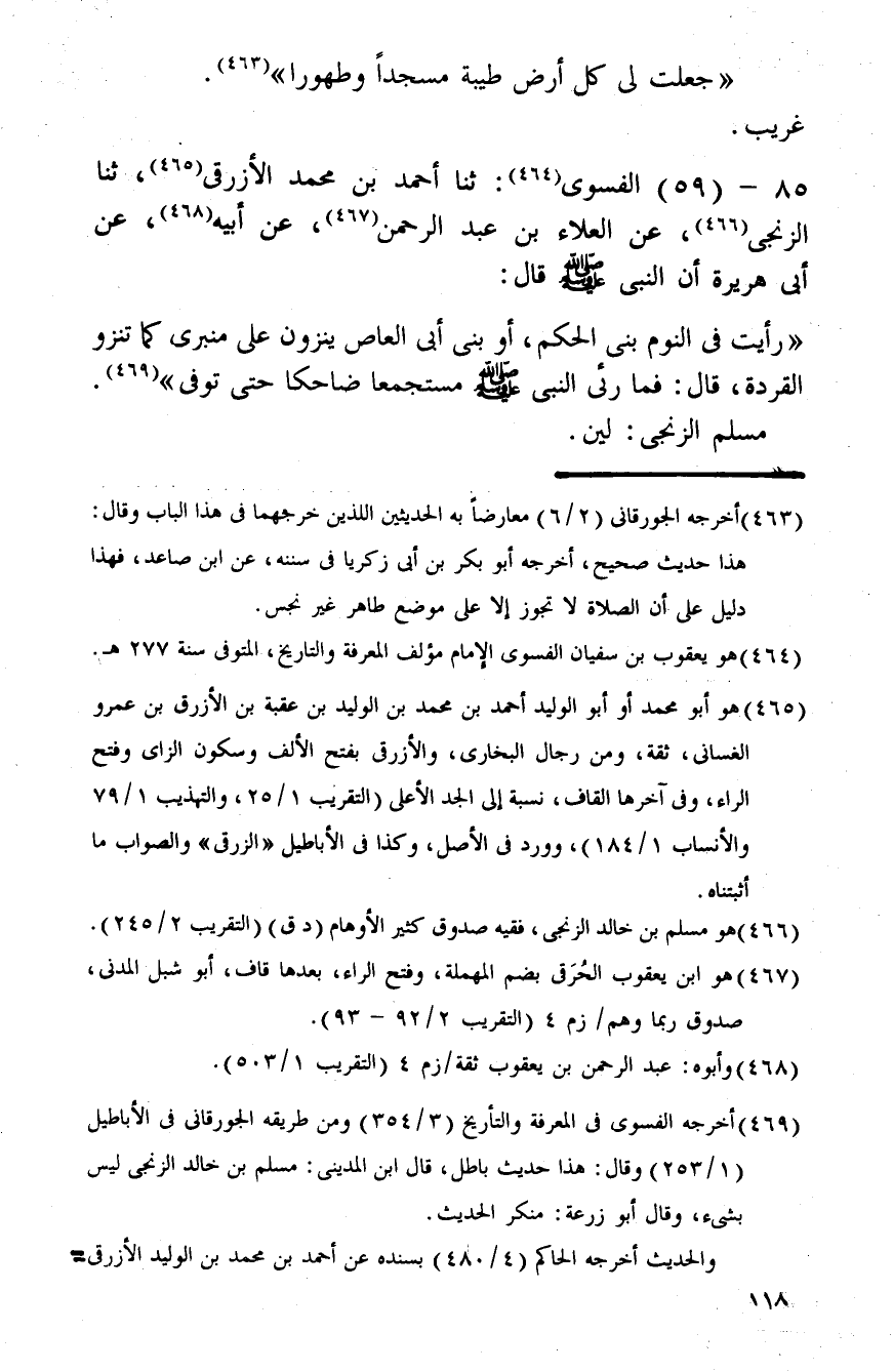 85 - (59) الفسوى: ثَنَا أَحْمد بن مُحَمَّد الْأَزْرَقِيّ، ثَنَا الزنْجِي، عَن الْعَلَاء بن عبد الرَّحْمَن، عَن أَبِيه، عَن أبي هُرَيْرَة أَن النَّبِي صلى الله عَلَيْهِ وَسلم قَالَ: " رَأَيْت فِي النّوم بنى الحكم، أَو بنى أبي الْعَاصِ ينزون على منبري كَمَا تنزو القردة، قَالَ: فَمَا رئي النَّبِي صلى الله عَلَيْهِ وَسلم مستجمعا ضَاحِكا حَتَّى توفّي ". مُسلم الزنْجِي: لين.