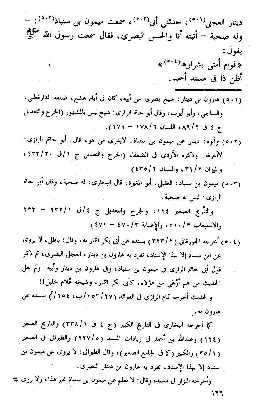 دِينَار الْعجلِيّ، حَدثنِي أبي، سَمِعت مَيْمُون بن سنباذ: - وَله صُحْبَة - أَتَيْته أَنا وَالْحسن الْبَصْرِيّ، فَقَالَ سَمِعت رَسُول الله صلى الله عَلَيْهِ وَسلم يَقُول: " قوام أمتِي بشرارها ". أَظن ذَا فِي مُسْند أَحْمد.