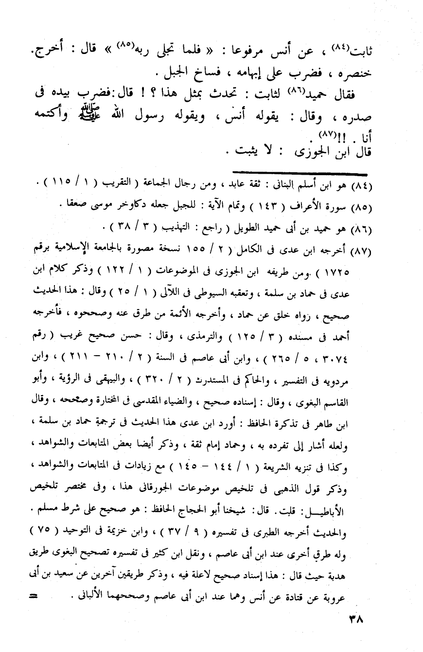 ثَابت، عَن أنس مَرْفُوعا: " فَلَمَّا تجلى ربه " قَالَ: أخرج خِنْصره، فَضرب على إبهامه، فساخ الْجَبَل. فَقَالَ حميد لِثَابِت: تحدث بِمثل هَذَا؟ {قَالَ: فَضرب بِيَدِهِ فِي صَدره، وَقَالَ: يَقُوله أنس، ويقوله رَسُول الله صلى الله عَلَيْهِ وَسلم وأكتمه أَنا.} ! قَالَ ابْن الْجَوْزِيّ: لَا يثبت.