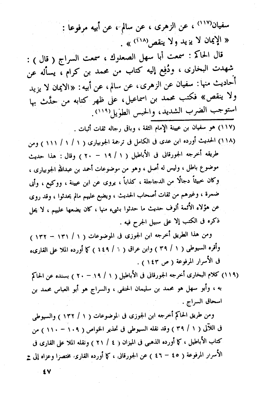 سُفْيَان، عَن الزُّهْرِيّ، عَن سَالم، عَن أَبِيه مَرْفُوعا: " الْإِيمَان لَا يزِيد وَلَا ينقص ". قَالَ الْحَاكِم: سَمِعت أَبَا سهل الصعلوك، سَمِعت السراج (قَالَ) : شهِدت البُخَارِيّ، وَدفع إِلَيْهِ كتاب من مُحَمَّد بن كرام، يسْأَله عَن أَحَادِيث مِنْهَا: سُفْيَان عَن الزُّهْرِيّ، عَن سَالم، عَن أَبِيه: " الْإِيمَان لَا يزِيد وَلَا ينقص " فَكتب مُحَمَّد بن إِسْمَاعِيل، على ظهر كِتَابه من حدث بهَا اسْتوْجبَ الضَّرْب الشَّديد، وَالْحَبْس الطَّوِيل.