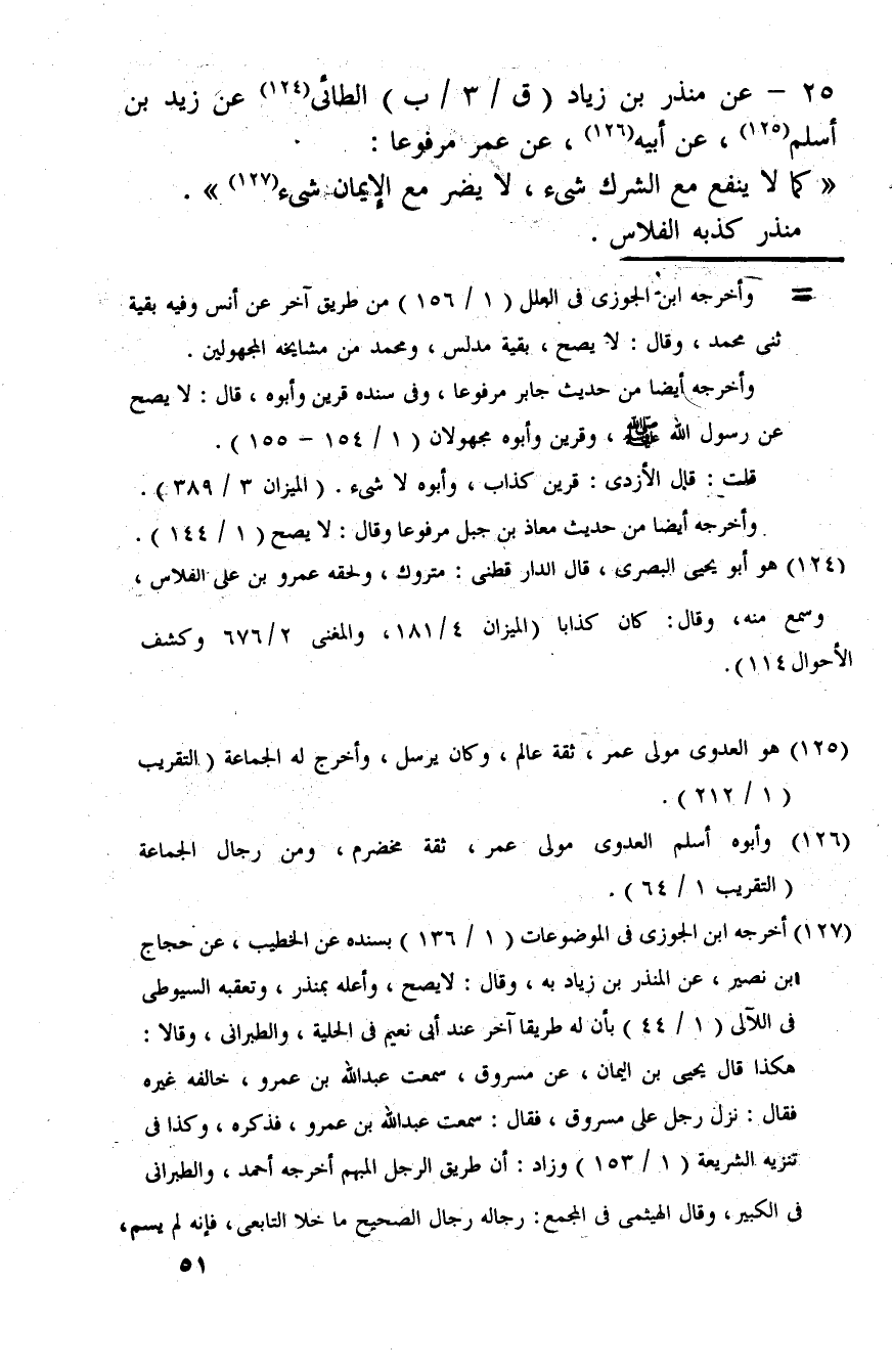 25 - عَن مُنْذر بن زِيَاد (ق / 3 / ب) الطَّائِي عَن زيد بن أسلم، عَن أَبِيه، عَن عمر مَرْفُوعا: " كَمَا لَا ينفع مَعَ الشّرك شَيْء، لَا يضر مَعَ الْإِيمَان شَيْء ". مُنْذر كذبه الفلاس.