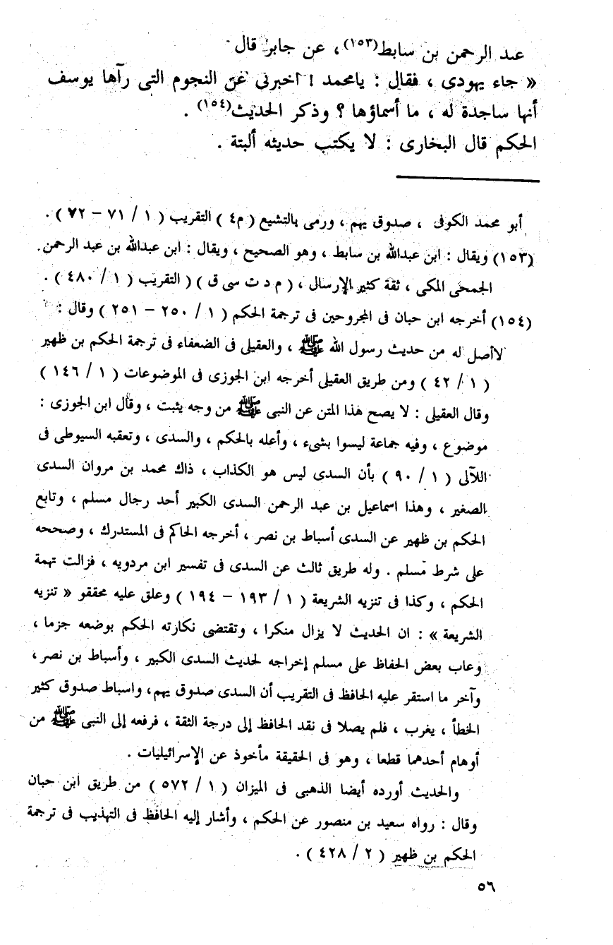 عبد الرَّحْمَن بن سابط، عَن جَابر قَالَ: " جَاءَ يَهُودِيّ، فَقَالَ: يَا مُحَمَّد! أَخْبرنِي عَن النُّجُوم الَّتِى رَآهَا يُوسُف الحكم قَالَ البُخَارِيّ: لَا يكْتب حَدِيثه أَلْبَتَّة.