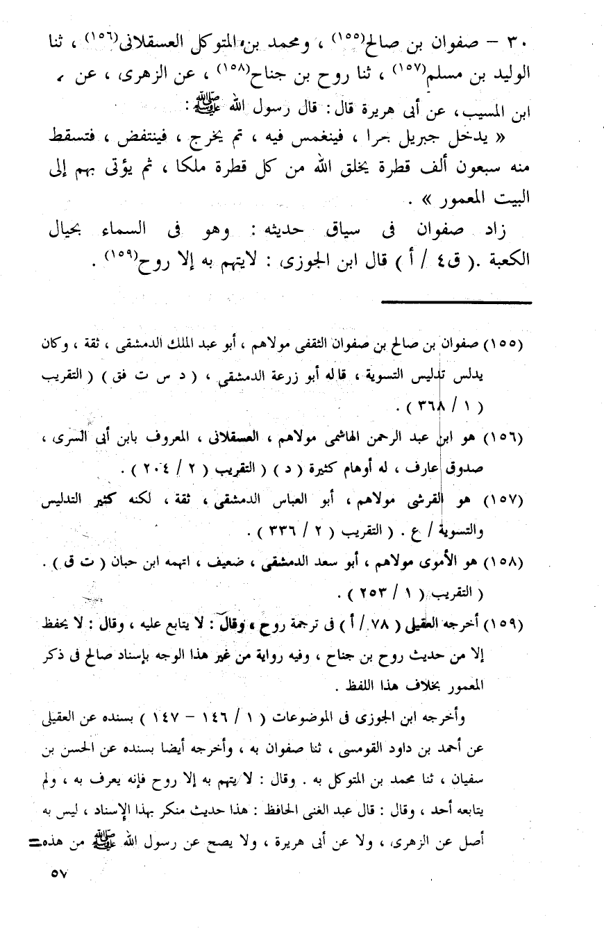 30 - صَفْوَان بن صَالح، وَمُحَمّد بن المتَوَكل الْعَسْقَلَانِي، ثَنَا الْوَلِيد بن مُسلم، ثَنَا روح بن جنَاح، عَن الزُّهْرِيّ، عَن ابْن الْمسيب، عَن أبي هُرَيْرَة قَالَ: قَالَ رَسُول الله صلى الله عَلَيْهِ وَسلم: " يدْخل جِبْرِيل بحراً، فينغمس فِيهِ، ثمَّ يخرج، فينتفض، فَتسقط مِنْهُ سَبْعُونَ ألف قَطْرَة يخلق الله من كل قَطْرَة ملكا، ثمَّ يُؤْتى بهم إِلَى الْبَيْت الْمَعْمُور ". زَاد صَفْوَان فِي سِيَاق حَدِيثه: وَهُوَ فِي السَّمَاء بحيال الْكَعْبَة. (ق 4 / أ) قَالَ ابْن الْجَوْزِيّ: لَا يهتم بِهِ إِلَّا روح