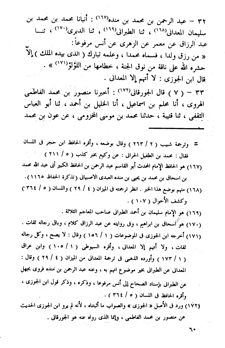 33 - (7) قَالَ الجورقاني: أخبرنَا مَنْصُور بن مُحَمَّد الفاطمي الْهَرَوِيّ، أَنا محلم بن إِسْمَاعِيل، أَنا الْخَلِيل بن أَحْمد، ثَنَا أَبُو الْعَبَّاس الثَّقَفِيّ، ثَنَا قُتَيْبَة، حَدثنَا مُحَمَّد بن مُوسَى المَخْزُومِي، عَن عون بن مُحَمَّد