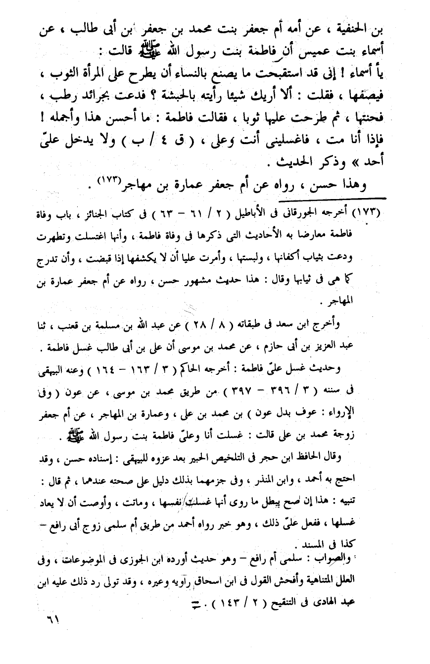 بن الْحَنَفِيَّة، عَن أمه أم جَعْفَر بنت مُحَمَّد بن جَعْفَر بن أبي طَالب، عَن أَسمَاء بنت عُمَيْس أَن فَاطِمَة بنت الرَّسُول الله صلى الله عَلَيْهِ وَسلم قَالَ: يَا أَسمَاء {إِنِّي قد استقبحت مَا يصنع بِالنسَاء أَن يطْرَح على الْمَرْأَة الثَّوْب، فيصفها، فَقلت: أَلا أريك شَيْئا رَأَيْته بِالْحَبَشَةِ؟ فَدُعِيت بجرائد رطب، فحنتها، ثمَّ طرحت عَلَيْهَا ثوبا، فَقَالَت فَاطِمَة: مَا أحسن هَذَا وأجمله} فَإِذا أَنا مت، فاغسليني أَنْت وعَلى، (ق 4 / ب) وَلَا يدْخل عَليّ أحد " وَذكر الحَدِيث. وَهَذَا حسن، رَوَاهُ عَن أم جَعْفَر عمَارَة بن مهَاجر.