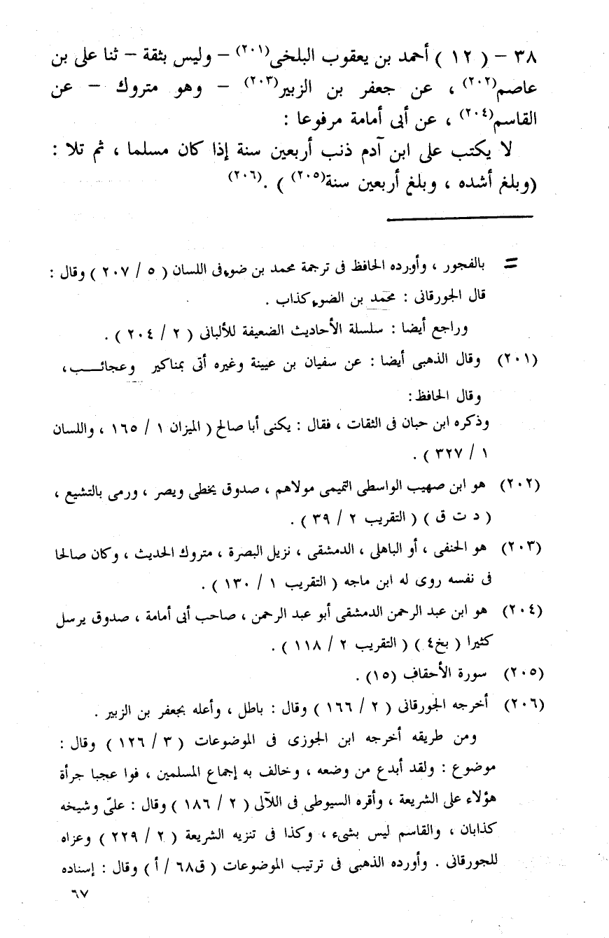 38 - (12) أَحْمد بن يَعْقُوب الْبَلْخِي - وَلَيْسَ بِثِقَة - ثَنَا عَليّ بن عَاصِم، عَن جَعْفَر بن الزبير - وَهُوَ مَتْرُوك - عَن الْقَاسِم، عَن أبي أُمَامَة مَرْفُوعا: لَا يكْتب على ابْن آدم ذَنْب أَرْبَعِينَ سنة إِذا كَانَ مُسلما، ثمَّ تَلا: {وَبلغ أشده، وَبلغ أَرْبَعِينَ سنة} .