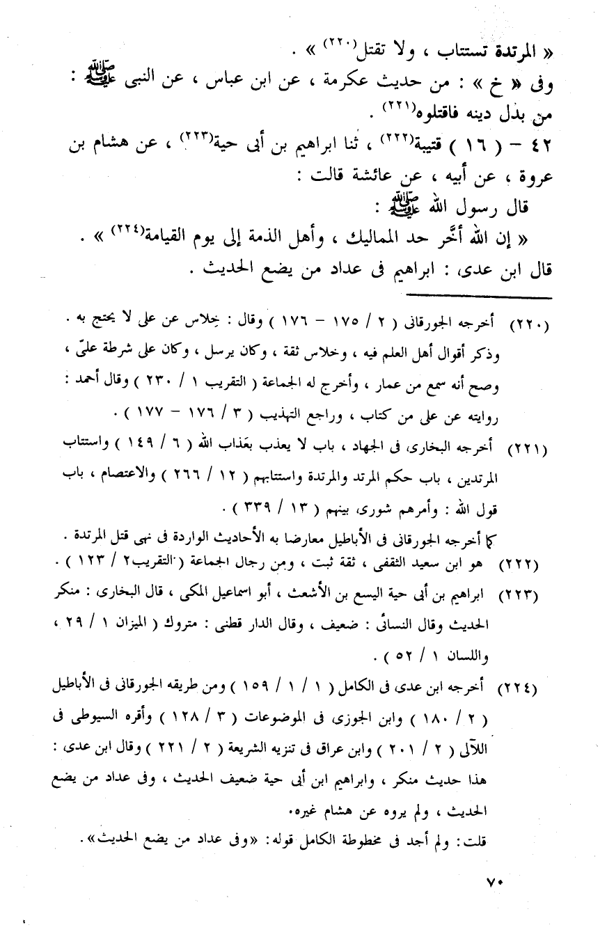 42 - (16) قُتَيْبَة، ثَنَا ابراهيم بن أبي حَيَّة، عَن هِشَام بن عُرْوَة، ع، ابيه، عَن عَائِشَة قَالَت: قَالَ رَسُول الله صلى الله عَلَيْهِ وَسلم: " إِن الله أخر حد المماليك، وَأهل الذِّمَّة إِلَى يَوْم الْقِيَامَة ". قَالَ ابْن عدي: ابراهيم فِي عداد من يضع الحَدِيث.
