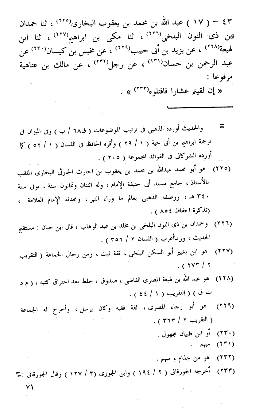 43 - (17) عبد الله بن مُحَمَّد بن يَعْقُوب البُخَارِيّ، ثَنَا حمدَان ابْن ذِي النُّون الْبَلْخِي، ثَنَا مكي بن إِبْرَاهِيم، ثَنَا ابْن لَهِيعَة، عَن يزِيد بن أبي حبيب، عَن مخيس بن كيسَان عَن عبد الرَّحْمَن بن حسان، عَن رجل، عَن مَالك بن عتاهية مَرْفُوعا: " إِن لَقِيتُم عشارا فَاقْتُلُوهُ ".