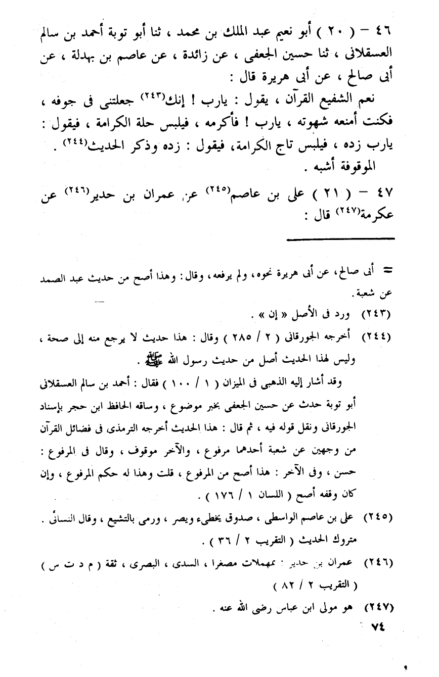 46 - (20) أَبُو نعيم بن عبد الْملك بن مُحَمَّد، ثَنَا أَبُو تَوْبَة أَحْمد بن سَالم الْعَسْقَلَانِي، ثَنَا حُسَيْن الْجعْفِيّ، عَن زَائِدَة، عَن عَاصِم بن بَهْدَلَة، عَن أبي صَالح، عَن أبي هُرَيْرَة قَالَ: نعم الشَّفِيع الْقُرْآن، يَقُول: يَا رب! إِنَّك جَعَلتني فِي جَوْفه، فَكنت أمْنَعهُ شَهْوَته، يَا رب فَأكْرمه فيلبس حلَّة الْكَرَامَة وَيَقُول يَا رب زده ليلبس تَاج الْكَرَامَة فَيَقُول زده وَذكر الحَدِيث. الْمَوْقُوفَة أشبه.