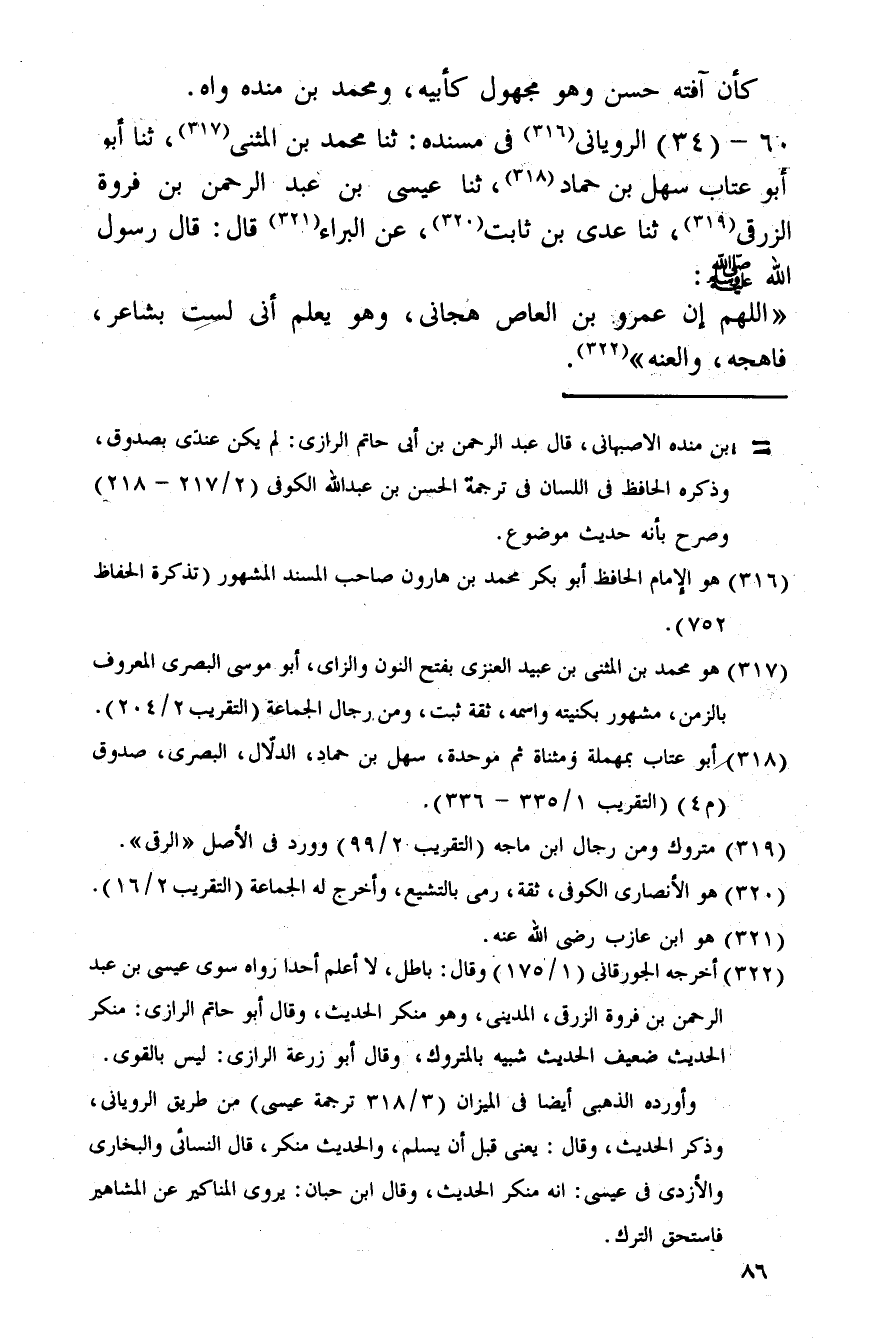 60 - (34) الرَّوْيَانِيّ فِي مُسْنده: ثَنَا مُحَمَّد بن الْمثنى، ثَنَا أَبُو أَبُو عتاب سهل بن حَمَّاد، ثَنَا عِيسَى بن عبد الرَّحْمَن بن فَرْوَة الزرقي، ثَنَا عدي بن ثَابت، عَن الْبَراء قَالَ: قَالَ رَسُول الله صلى الله عَلَيْهِ وَسلم: " اللَّهُمَّ إِن عَمْرو بن الْعَاصِ هجاني، وَهُوَ يعلم أَنِّي لست بشاعر، فاهجه، والعنه ".