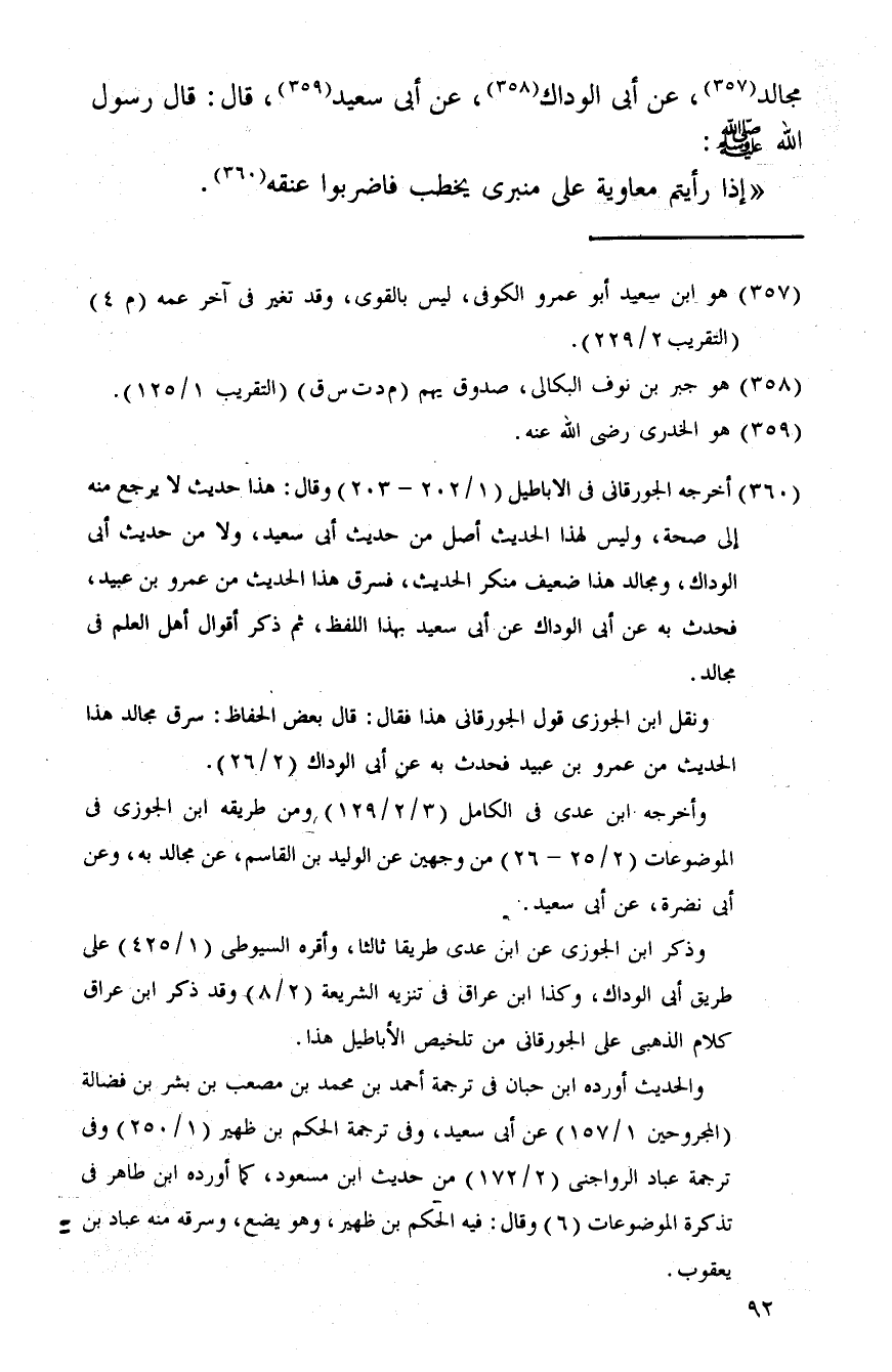 مجَالد، عَن أبي الوداك، عَن أبي سعيد، قَالَ: قَالَ رَسُول الله صلى الله عَلَيْهِ وَسلم: " إِذا رَأَيْتُمْ مُعَاوِيَة على منبري يخْطب فاضربوا عُنُقه.