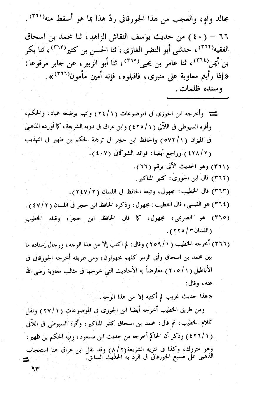 66 - (40) من حَدِيث يُوسُف النقاش الزَّاهِد، ثَنَا مُحَمَّد بن إِسْحَاق الْفَقِيه، حَدثنِي أَبُو النَّضر الْغَازِي، ثَنَا الْحسن بن كثير، ثَنَا بكر بن أَيمن، ثَنَا عَامر بن يحيى، ثَنَا أَبُو الزبير، عَن جَابر مَرْفُوعا: " إِذا رَأَيْتُمْ مُعَاوِيَة على منبري، فاقبلوه، فَإِنَّهُ أَمِين الْمَأْمُون ".