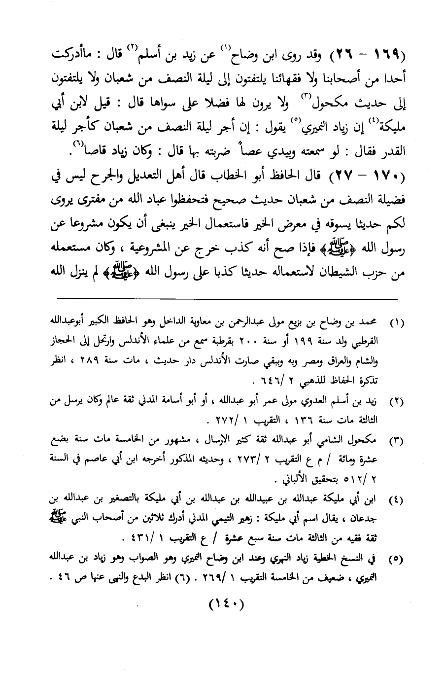 وروى ابن وضاح عن زيد بن أسلم قال: ما أدركت أحداً من أصحابنا ولا فقهائنا يلتفتون إلى ليلة النصف من شعبان، ولا يلتفتون إلى حديث مكحول، ولا يرون لها فضلاً على ما سواها، وقيل لابن أبي مليكة: إن زياداً النهري يقول: إن أجر ليلة النصف من شعبان كأجر ليلة القدر. فقال: لو سمعته وبيدي عصاً لضربته بها. وكان زياد قاصاً. قال الحافظ أبو الخطاب: قال أهل التعديل والجرح: ليس في فضل النصف من شعبان حديث صحيح.