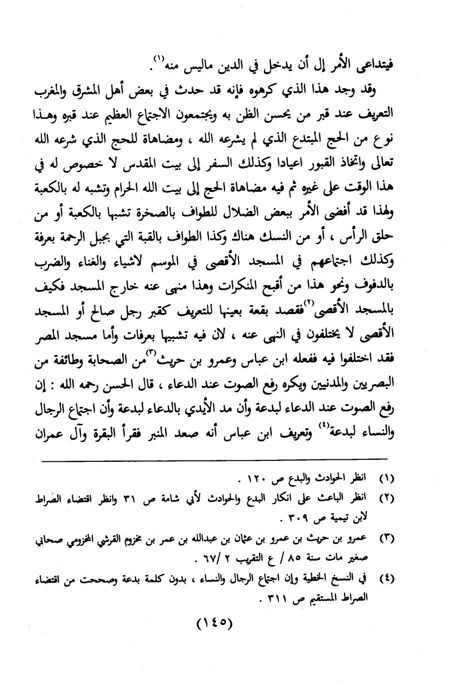 وكذلك السفر إلى بيت المقدس لا خصوص له في هذا الوقت على غيره. ثم فيه مضاهاة الحج إلى البيت الحرام وتشبه له بالكعبة. ولذهذا قد أفضى الأمر ببعض الضُلاّل للطواف بالصخرة تشبيهاً بالكعبة، أو من حلق الرأس، أو من النسك هناك كذلك الطواف بالقبة التي بجبل الرحمن بعرفة، وكذلك اجتماعهم في المسجد الأقصى في الموسم لأشياء. والغناء والضرب بالدفوف ونحو هذا من أقبح المنكرات. وهذا منهي عنه خارج المسجد، فكيف بالمسجد الأقصى. فقصد بقعة بعينها للتعريف فيها، كقبر رجل صالح أو المسجد الأقصى، لا يختلفون في النهي عنه لأن فيه تشبيهاً بعرفات.