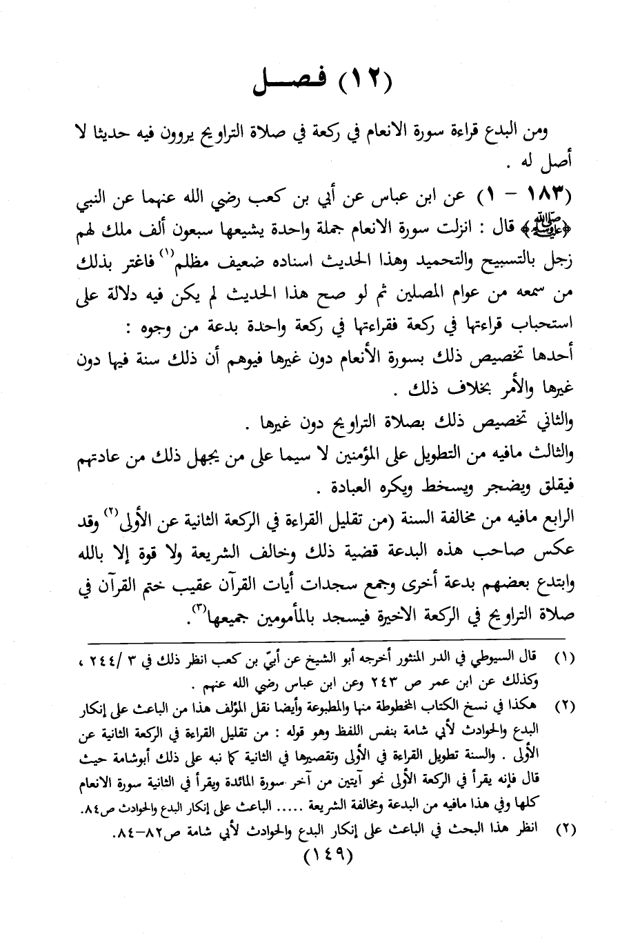 سورة الأنعام في ركعة صلاة التراويح، ويرون في ذلك حديثاً لا أصل له عن ابن عباس عن أبي بن كعب رضي الله عنهما عن النبي (، قال: " أنزلت سورة الأنعام جملة واحدة يشيعها سبعون ألف ملك بالتسبيح والتحميد ". وهذا الحديث إسناده ضعيف مظلم، فاغتر بذلك من سمعه من عوام المصلين. ثم لو صح هذا الحديث لم يكن فيه دلالة على استحباب قراءتها في ركعة.