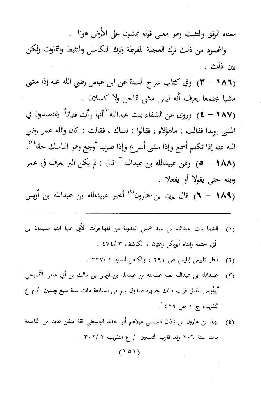 وروي عن الشفاء بنت عبد الله أنها رأت فتياناً يقتصدون في المشي رويداً، فقالت: ما هؤلاء؟ فقالوا: نُساك. فقالت: كان والله عمر رضي الله عنه إذا تكلم أسمع، وإذا مشى أسرع، وإذا ضرب أوجع، وهو الناسك حقاً.