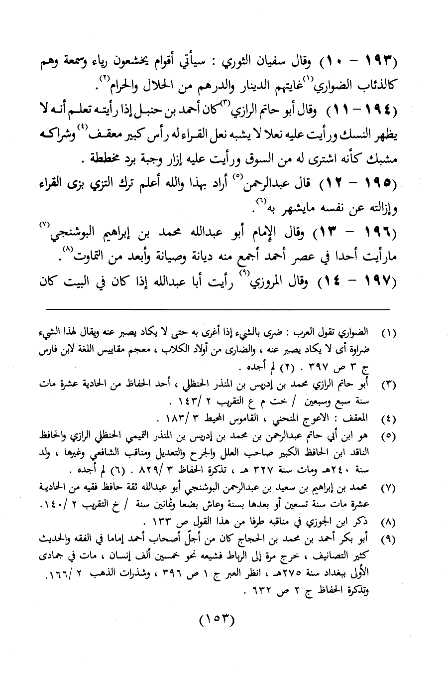وقال أبو حاتم الرازي: كان أحمد بن حنبل إذا رأيته تعلم أنه لا يظهر النسك، ورأيت عليه نعلاً لا يشبه نعل القراء، له رأس كبير معقف، وشراكه مشبك، كأنه اشتري له من السوق، ورأيت عليه إزاراً وجبة برد مخططة. قال عبد الرحمن: أراد بهذا - والله اعلم ترك التزين بزي القراء، وإزالته عن نفسه ما يشهر به.