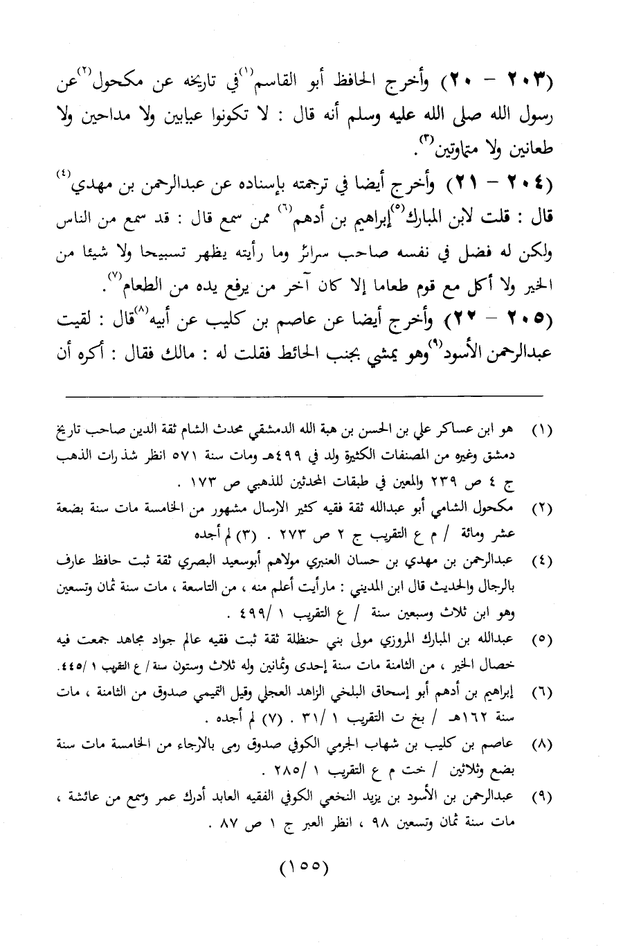 وأخرج الحافظ أبو القاسم في تاريخه، عن محكول، عن رسول الله (أنه قال: " لا تكونوا عيّابين، ولا مداحين، ولا طعانين، ولا متماوتين ".