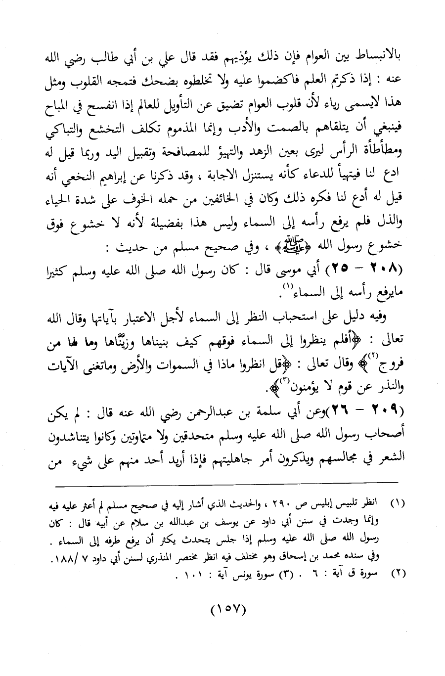 ومثل هذا لا يسمى رياء لأن قلوب العوام تضيق عن التأويل للعالم إذا انفسح للمباح؛ فينبغي أن يلقاهم بالصمت والأدب. وإنما المذموم تكلف التخشع والتباكي وطأطأة الرأس ليرى بعين الزهد. وربما قيل له: " ادع لنا " فتهيأ للدعاء وكأنه مستنزل الإجابة. وقد ذكرنا عن إبراهيم النخعي: أنه قيل له " ادع لنا " فكره ذلك، وكان من الخائفين - ومن جملة الخوف الحرص على شدة الحياء والذل فلم يرفع رأسه إلى السماء. وليس هذا بفضيلة لأنه لا خشوع فوق خشوع رسول الله (فقد كان كثيراً ما يرفع رأسه إلى السماء، وفيه دليل على اسحباب النظر إلى السماء لأجل الاعتبار بآياتها، وقال تعالى: (أفلم ينظروا إلى السماء فوقهم كيف بنيناها وزَيّنَّاها وما لها من فروج) . وقال تعالى: (قل انظروا ماذا في السموات والأرض وما تغني الآيات والنذر عن قوم لا يؤمنون) .