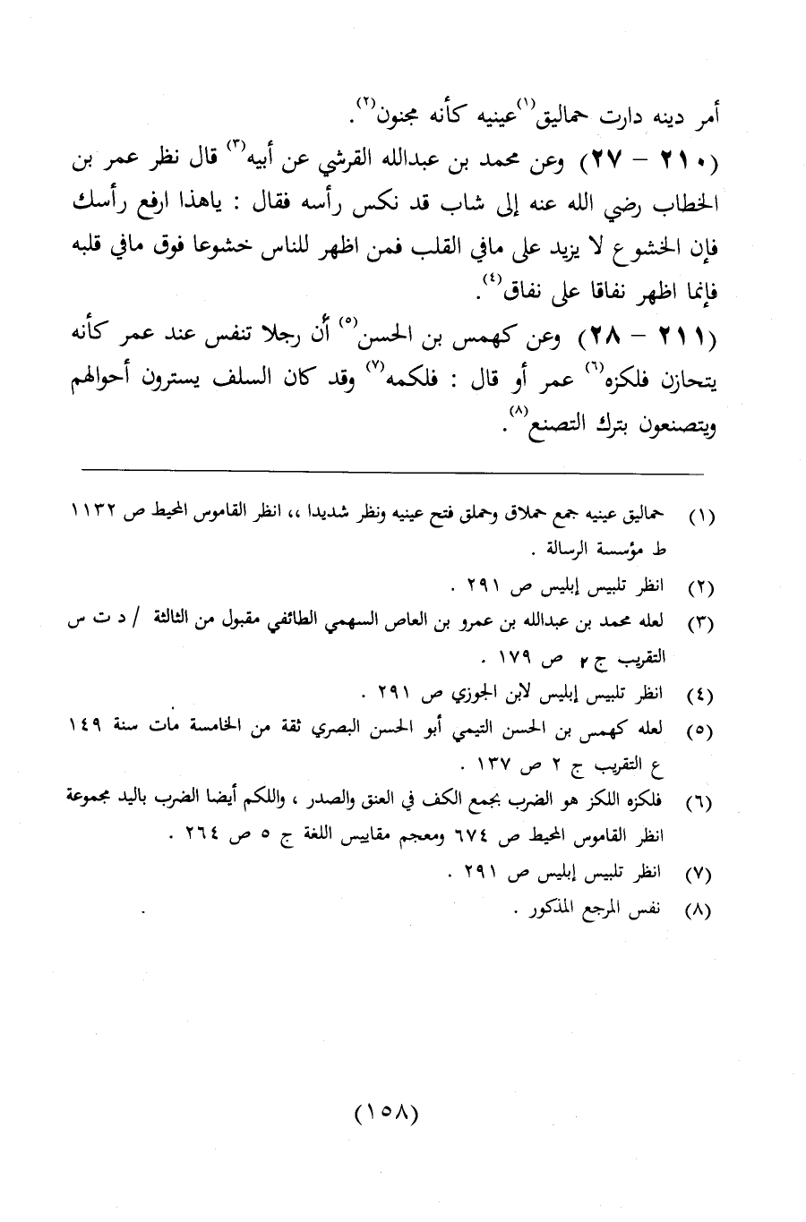 وعن محمد بن عبد الله القرشي عن أبيه، قال: نظر عمر بن الخطاب رضي الله عنه إلى شاب نكس رأسه، فقال: يا هذا ارفع رأسك؛ فإن الخشوع لا يزيد على ما في القلب؛ فمن أظهر للناس خشوعاً فوق ما في قلبه فإنما أظهر نفاقاً على نفاق.