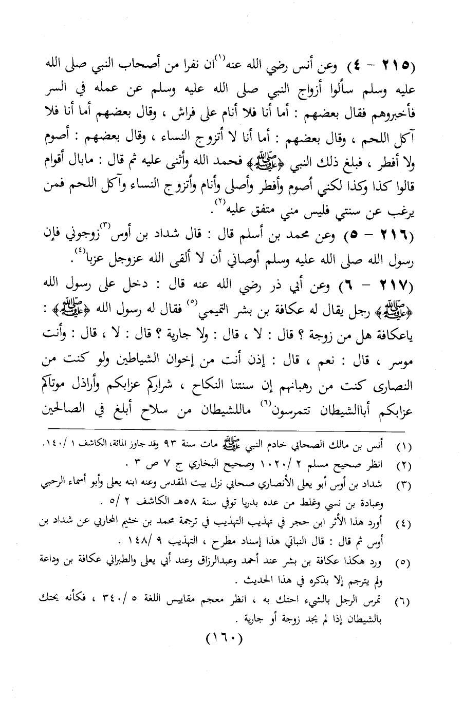 وعن أبي ذر رضي الله عنه، قال: دخل على رسول الله (رجل يقال له عكافة بن بشر التميمي، فقال رسول الله) : " يا عكافة هل من زوجة؟ " قال: لا، قال: " ولا جارية؟ "، قال: لا، قال: " وأنت موسر؟ "، قال: نعم، قال: " إذاً أنت من إخوان الشياطين، لو كنت من النصارى كنت من رهبانهم، إن سنتنا النكاح، شراركم عزابكم ما للشيطان من سلاح أبلغ في الصالحين