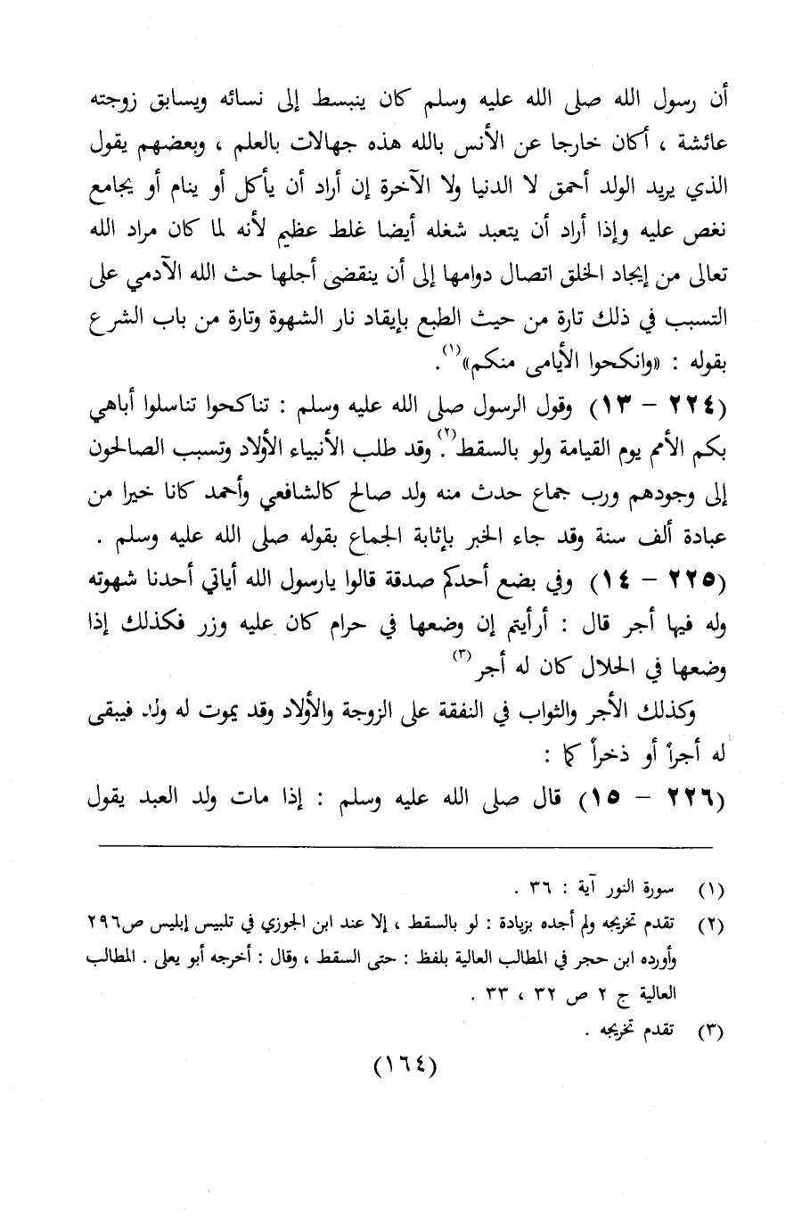 وبعضهم يقول: الذي يريد الولد أحمق، فلا نال الدنيا ولا الآخرة، إن أراد أن يأكل أو ينام أو يجامع نغص عليه، وإذا أراد أن يتعبد شغله أيضاً - غلط عظيم لأنه لما كان مراد الله تعالى من إيجاد الخلق اتصال دوامها إلى أن ينقضي أجلها، حثّ الله تعالى الآدمي على ذلك، تارة من حيث الطبع بإيقاد نار الشهوة، وتارة من باب الشرع بقوله: (وأنكحوا الأيامى منكم) ، وقول الرسول) : " تناكحوا تناسلوا فإني أباهي بكم الأمم يوم القيامة ولو بالسقط ".