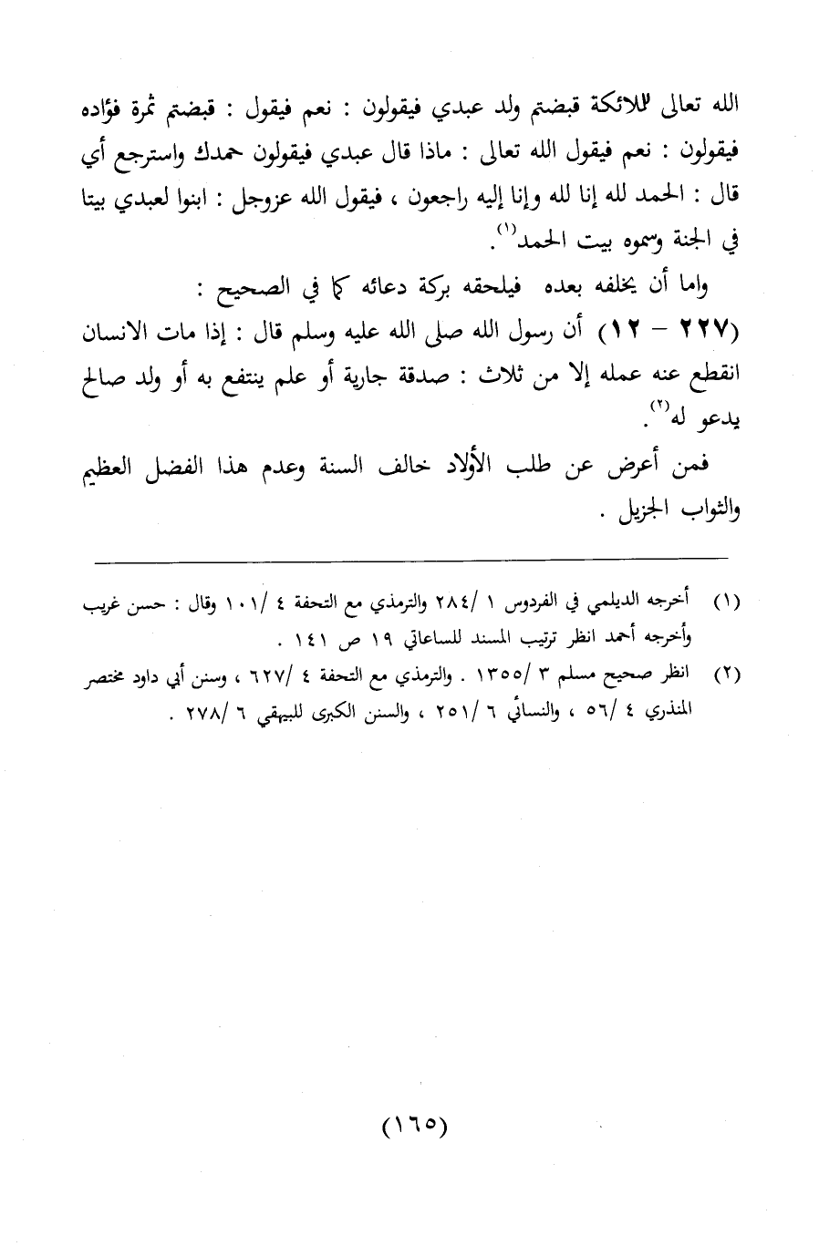 وإما أن يخلفه بعده فيلحقه بركة دعائه كما في الصحيح أن رسول الله (قال: " إذا مات الإنسان انقطع عمله إلا من ثلاث: صدقة جارية، أو علم ينتفع به، أو ولد صالح يدعو له ". فمن أعرض عن طلب الأولاد خالف السنة، وعُدِم هذا الفضل والثواب الجزيل.
