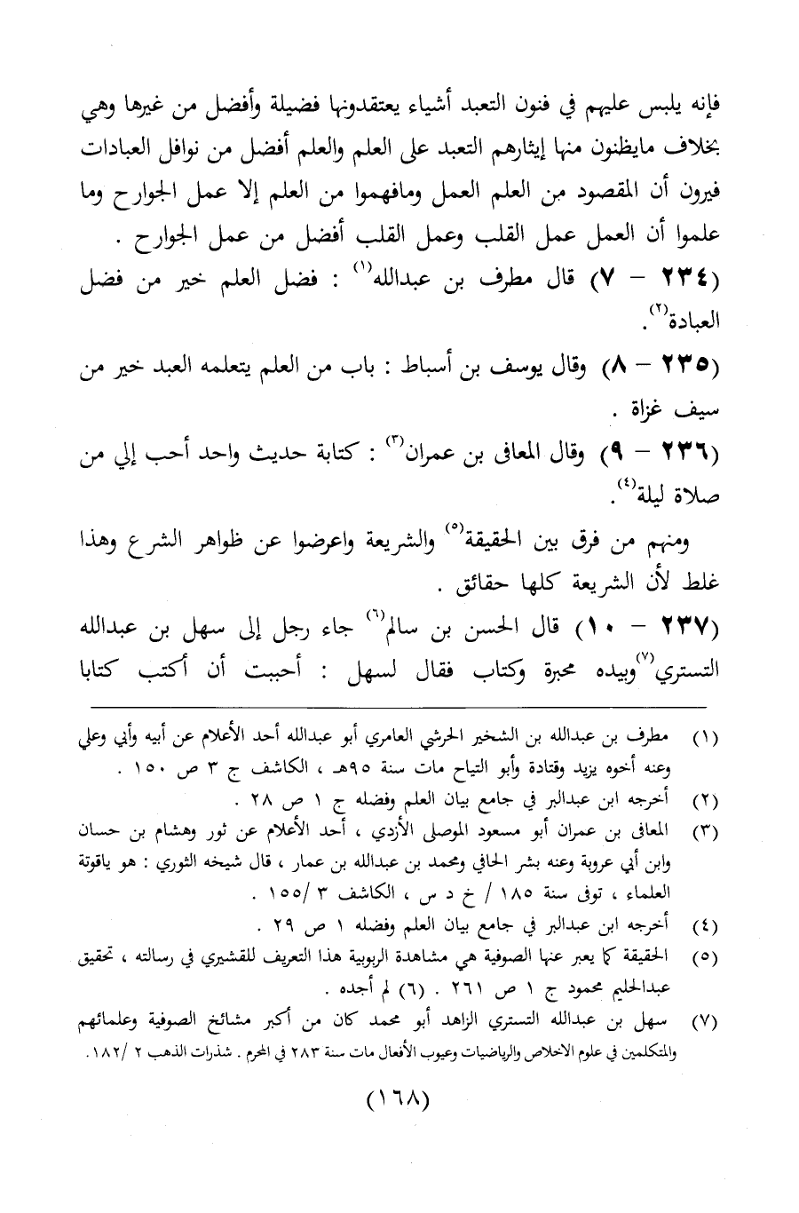 قال مطرف بن عبد الله: فضل العلم خير من فضل العبادة. وقال يوسف ابن أسباط: باب من العلم يتعلمه العبد خير من سيف غزاة.