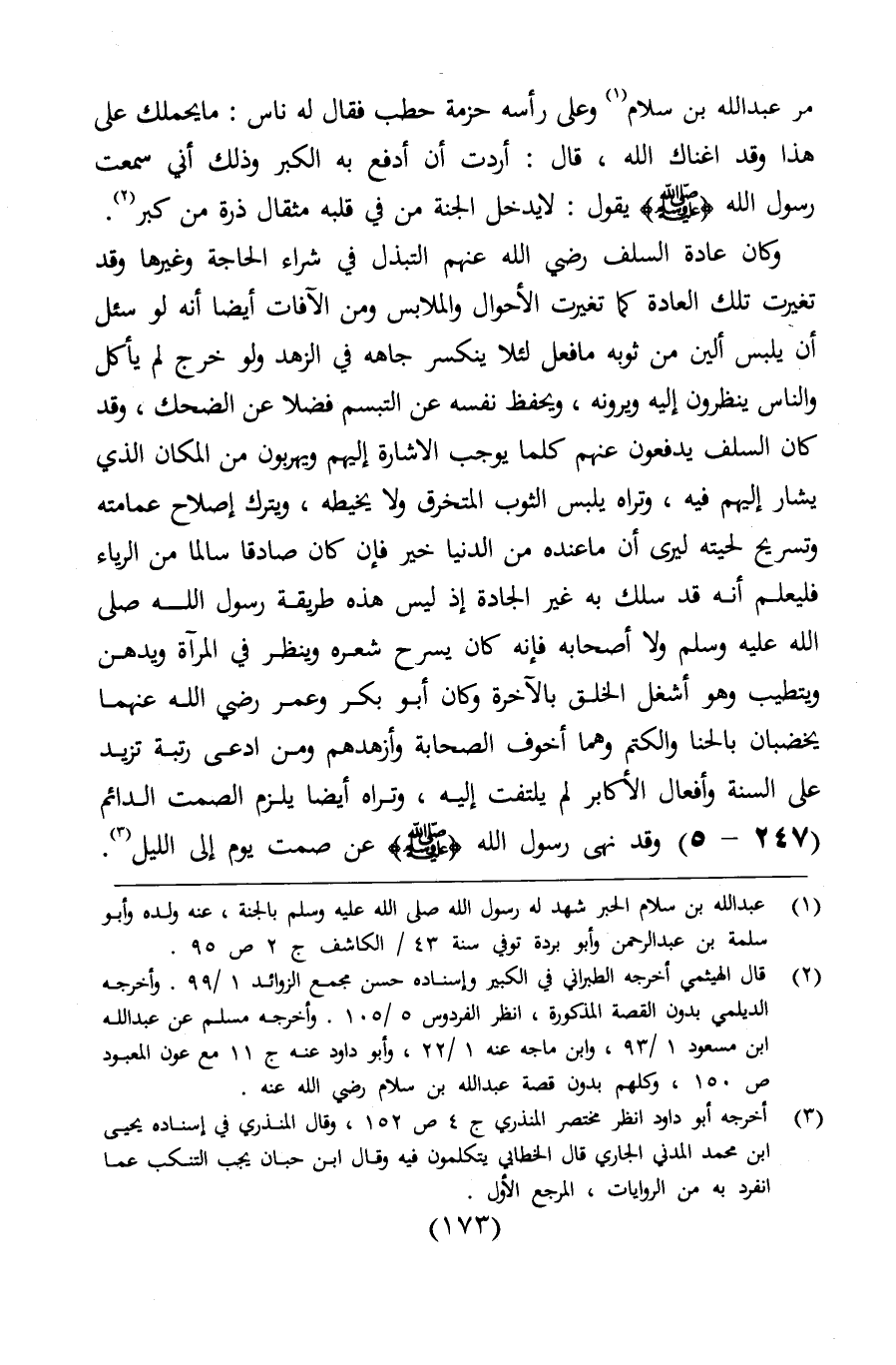 مر عبد الله بن سلام وعلى رأسه حطب، فقال له ناس: ما يحملك على هذا وقد أغناك الله؟ قال: أردت أن أدفع به الكبر، وذلك أني سمعت رسول الله (يقول: " لا يدخل الجنة من كان في قلبه مثقال ذرة من كبر ". وكان عادة السلف رضي الله عنهم التبذل في شراء الحاجة وغيرها وقد تغيرت تلك العادة كما تغيرت تلك الأحوال والملابس.