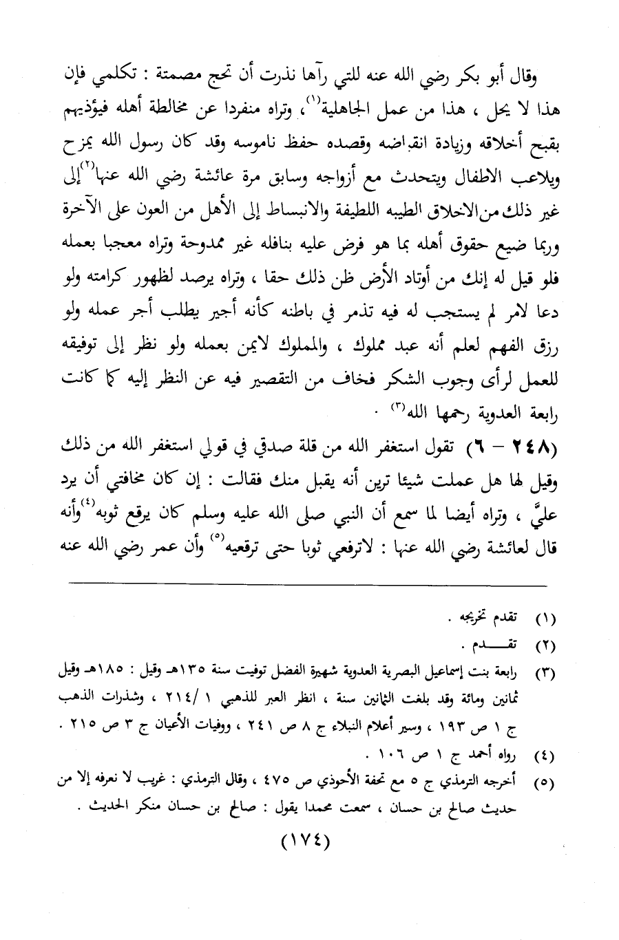 وقال أبو بكر رضي الله عنه للتي رآها نذرت أن تحج مصمته: تكلمي فأن هذا لا يحل، هذا من عمل الجاهلية.