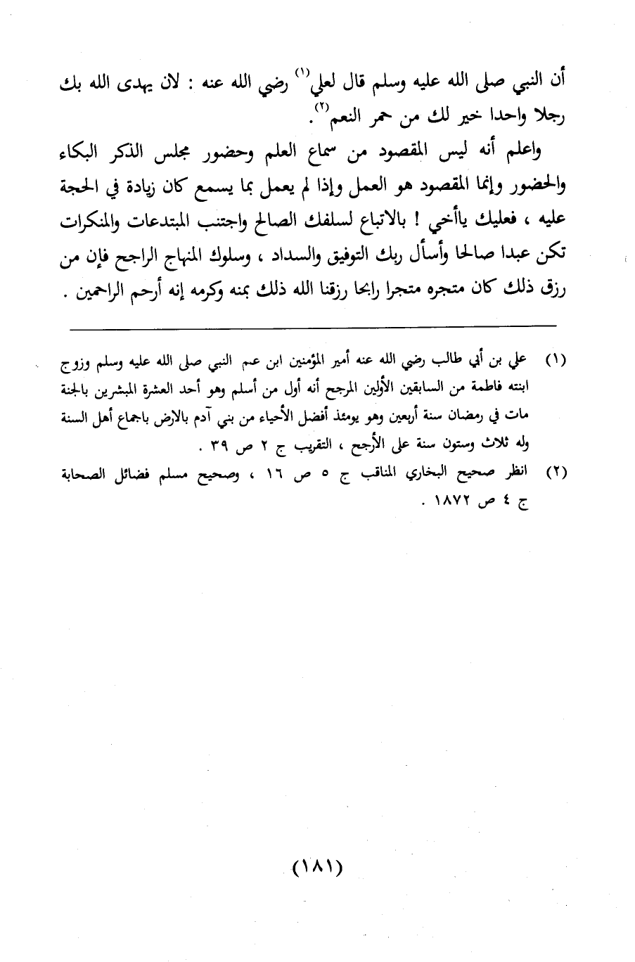 أن النبي (قال لعليّ رضي الله عنه: " لأن يهدي الله بك رجلاً واحداً خير لك من حمر النعم ".