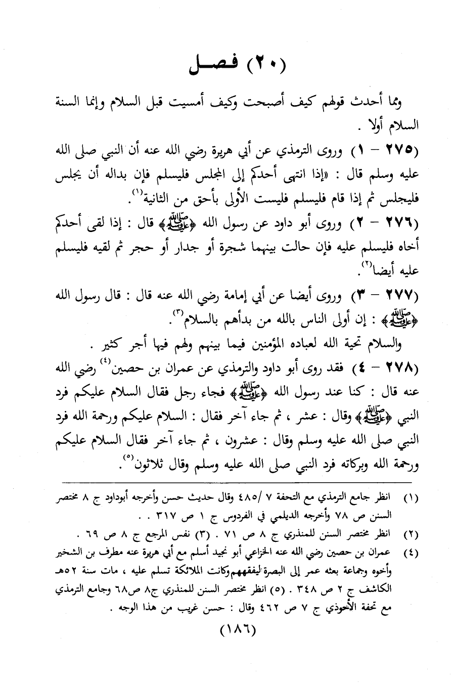 والسلام تحية الله لعباده المؤمنين فيما بينهم، ولهم فيها أجر كثير، فقد روى أبو داود والترمذي، عن عمران بن حصين رضي الله، قال: كنا عند رسول الله (، فجاء رجل فقال: السلام عليكم، فرد النبي (وقال: " عشر "، ثم جاء آخر فقال: السلام عليكم ورحمة الله، فرد النبي (، فقال: " عشرون " ثم جاء آخر فقال: السلام عليكم ورحمة الله وبركاته، فرد عليه فجلس، وقال: " ثلاثون ".
