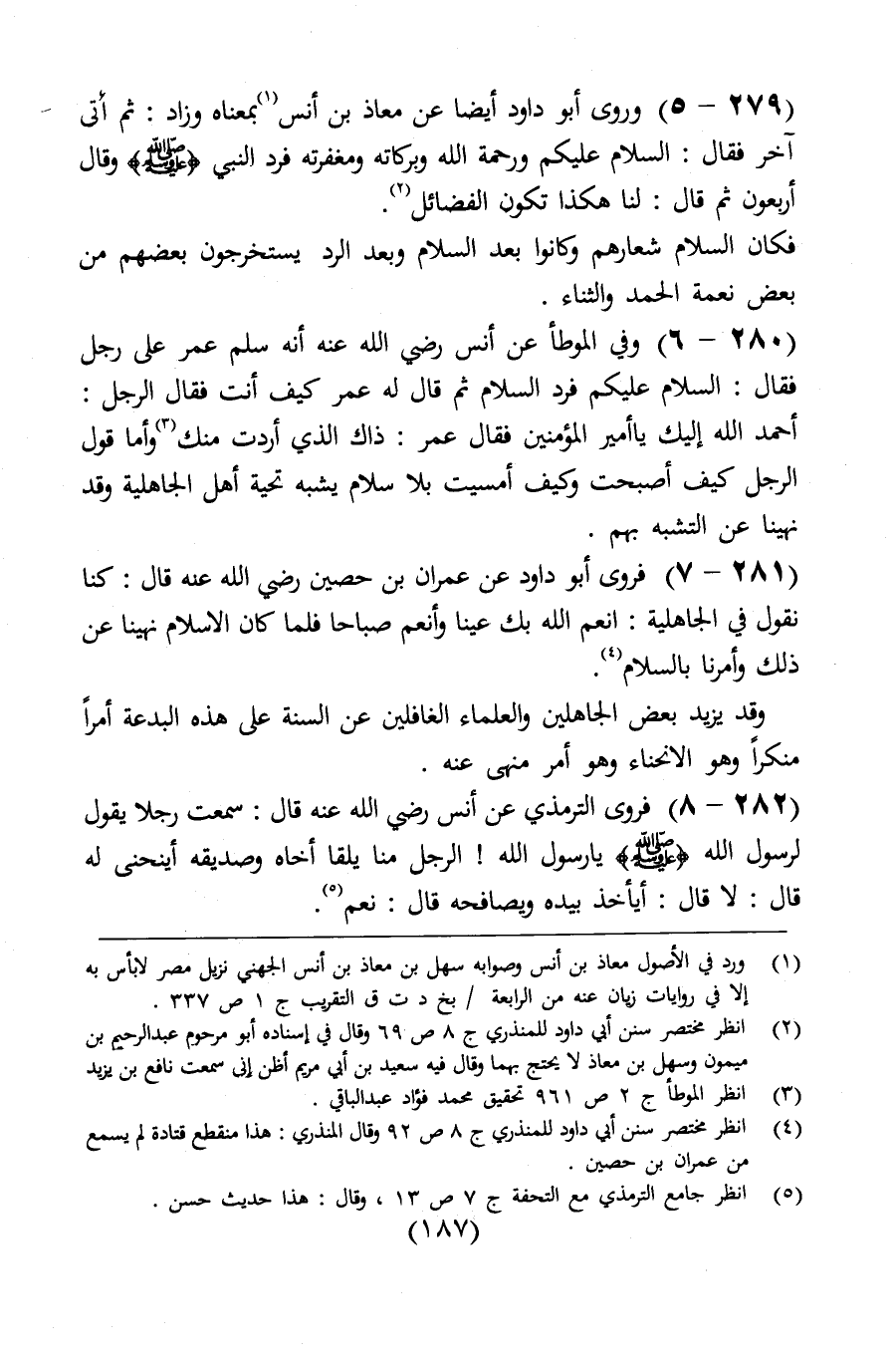 وروى أبو داود أيضاً، عن معاذ بن أنس معناه، وزاد: ثم أتى آخر فقال: السلام عليكم ورحمة الله وبركاته ومغفرته، فردّ عليه النبي (، وقال: " أربعون "، ثم قال لنا: " هكذا تكون الفضائل ".