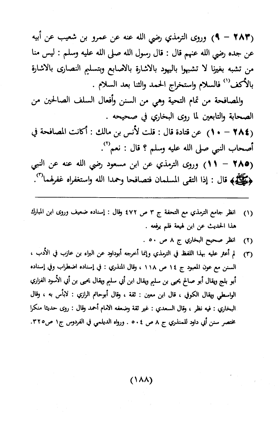 وروى الترمذي رضي الله عنه، عن عمرو بن شعيب، عن أبيه، عن جده رضي الله عنهم، قال: قال رسول الله) : " ليس منا من تشبه بغيرنا، لا تشبهوا باليهود ولا بالنصارى، فإن تسليم اليهود الإشارة بالأصابع، وتسليم النصارى الإشارة بالأكف ".