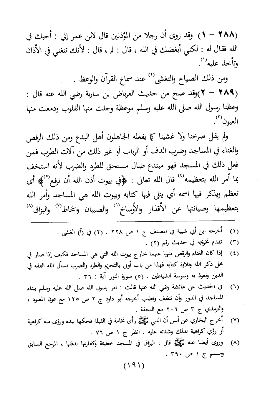 ومن ذلك الرقص، والغناء في المساجد، وضرب الدف أو الرباب، أو غير ذلك من آلات الطرب.